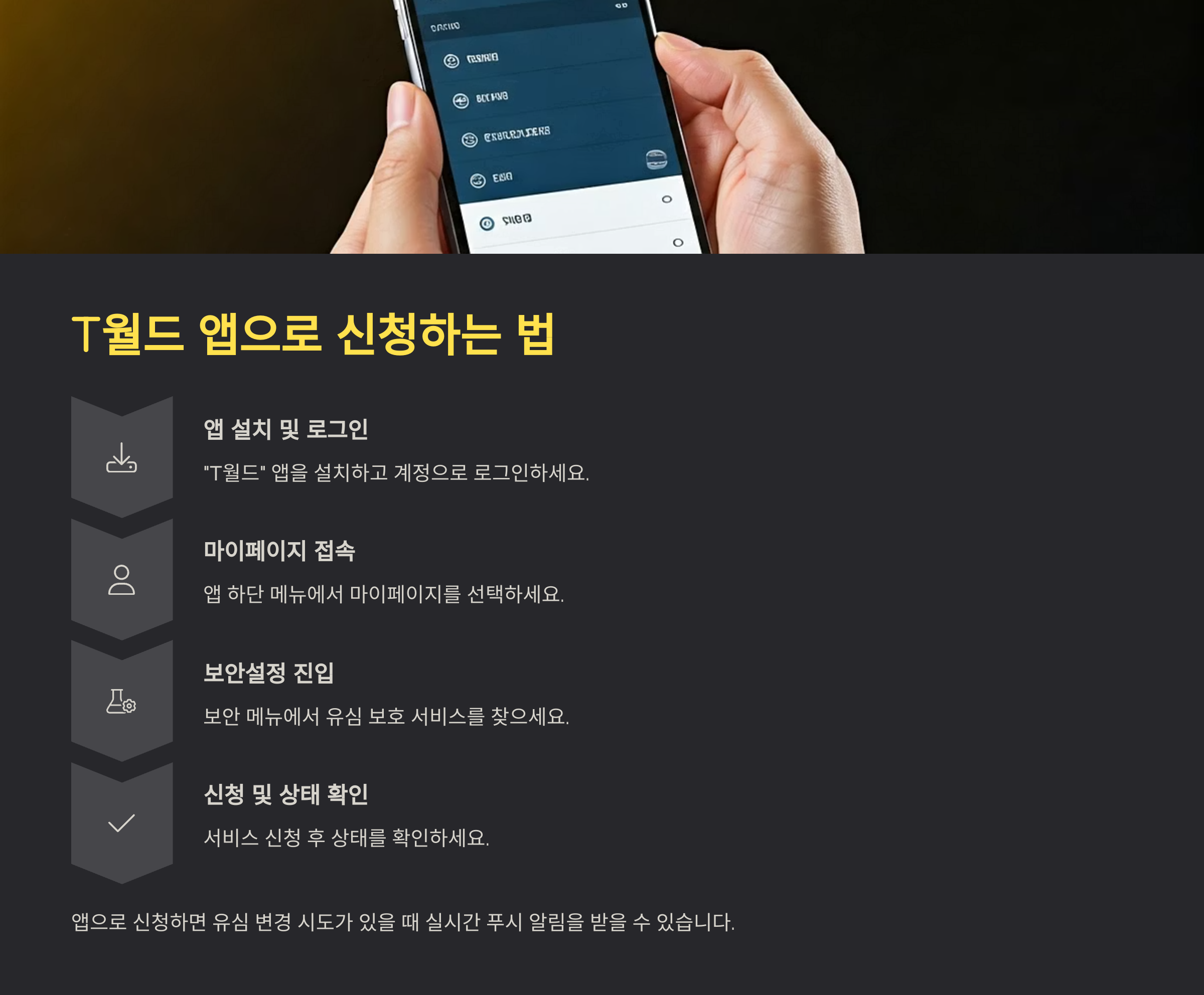 첫 번째 👉 가입 완료 여부 확인하기! T월드 앱 또는 홈페이지 마이페이지에서 '유심 보호 서비스 가입' 상태를 확인해보세요.
