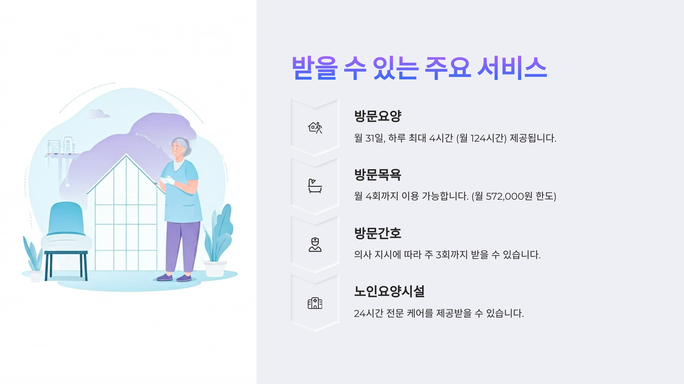 재가서비스는 집에서 돌봄을 받는 방식이고, 시설급여는 요양원 같은 곳에 입소해서 장기적으로 케어를 받는 거예요.