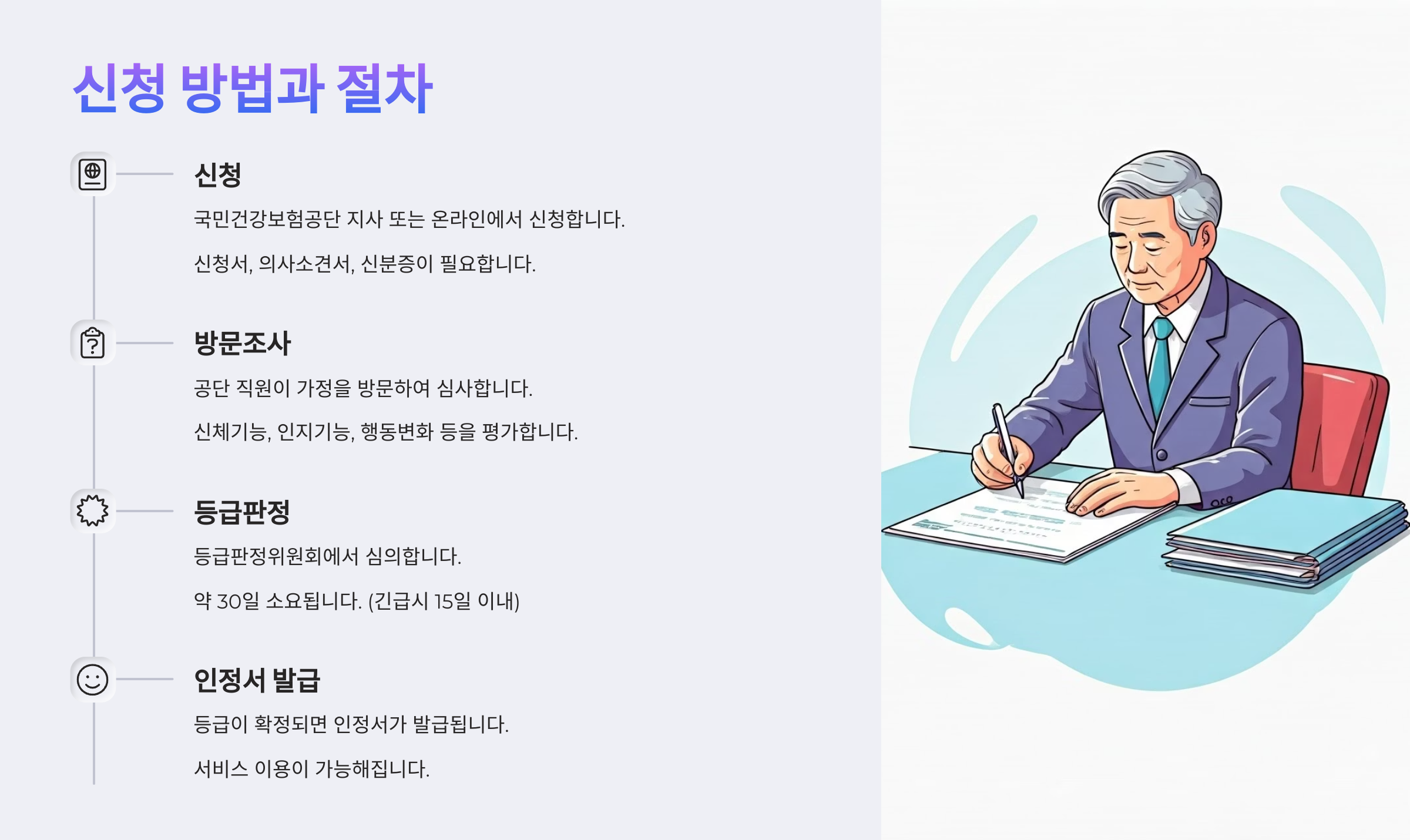 모든 서류가 접수되면 ‘등급판정위원회’에서 최종 등급을 결정해요. 이 과정까지 보통 1개월 정도 소요돼요.