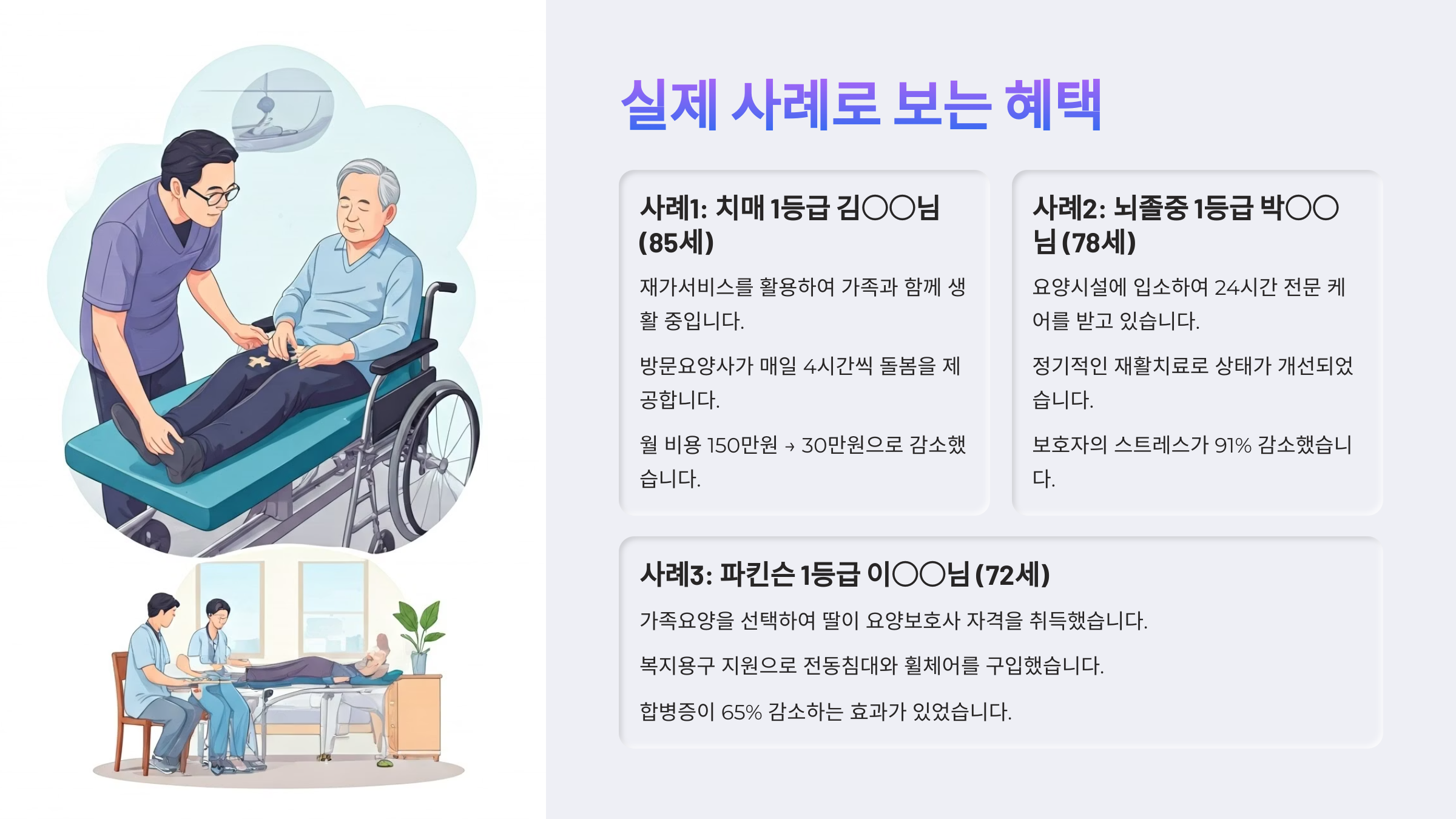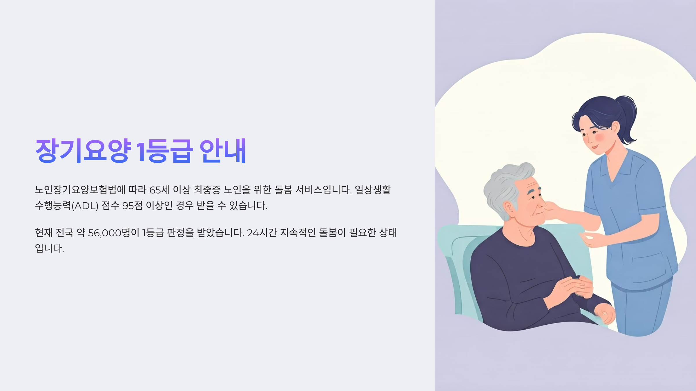 이처럼 실제 사례를 보면 장기요양 1등급 서비스가 단순한 돌봄을 넘어 삶의 질을 높이는 데 큰 역할을 하고 있다는 걸 느낄 수 있어요.