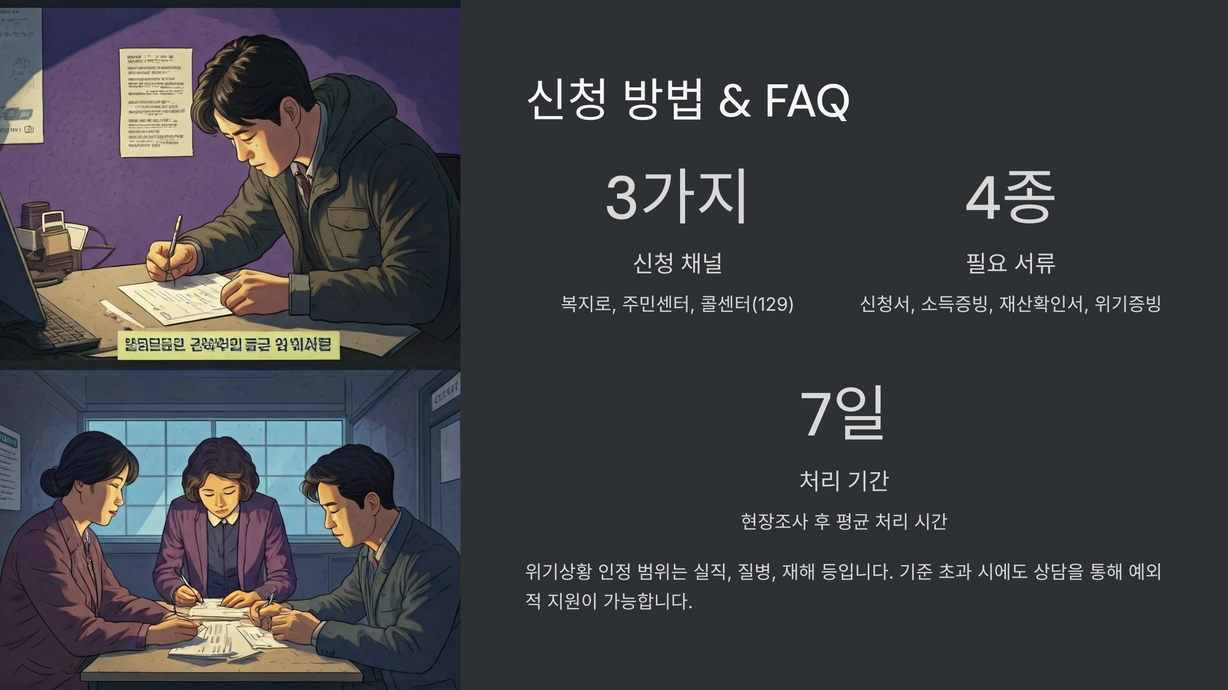 예를 들어, 실직, 중한 질병, 가정폭력, 사망, 이혼 등으로 소득이 급격히 줄었거나 당장 생계가 어려워졌을 때 신청할 수 있어요. 심지어 재산이 다소 있어도 사유가 명확하면 지원 가능성이 높아요.