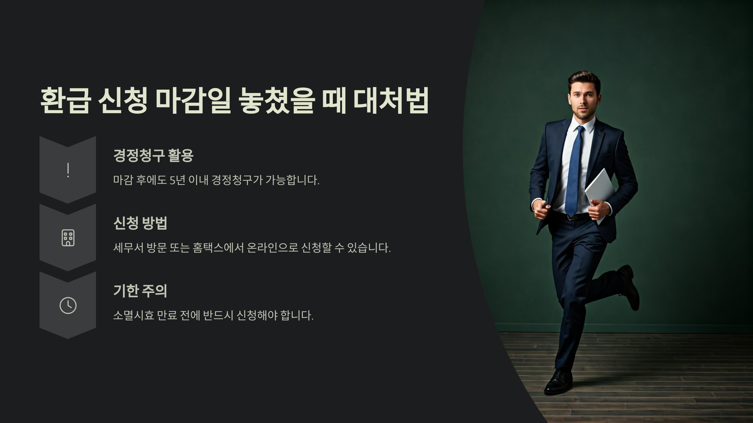 하지만 완전히 불가능한 건 아니에요. ‘기한 후 신고’ 또는 ‘경정청구’를 통해 정당한 사유가 있다면 환급을 받을 수 있어요. 다만, **신청기한 경과 후 5년 이내**여야 해요.