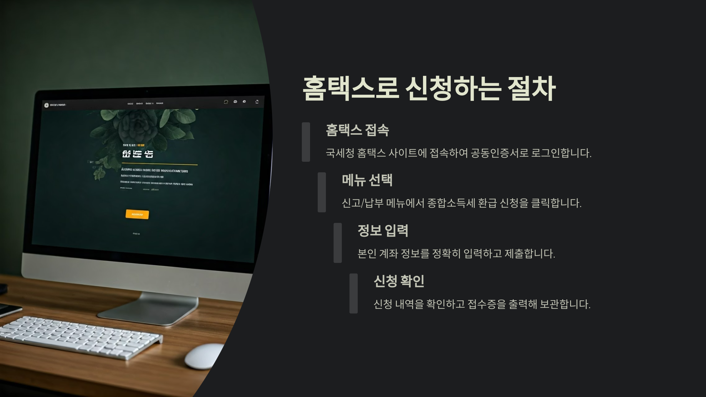 1️⃣ 홈택스 로그인 → 2️⃣ [신고/납부] → 3️⃣ [종합소득세 신고] → 4️⃣ 환급계좌 입력 → 5️⃣ 공제 입력 → 6️⃣ 신고서 제출