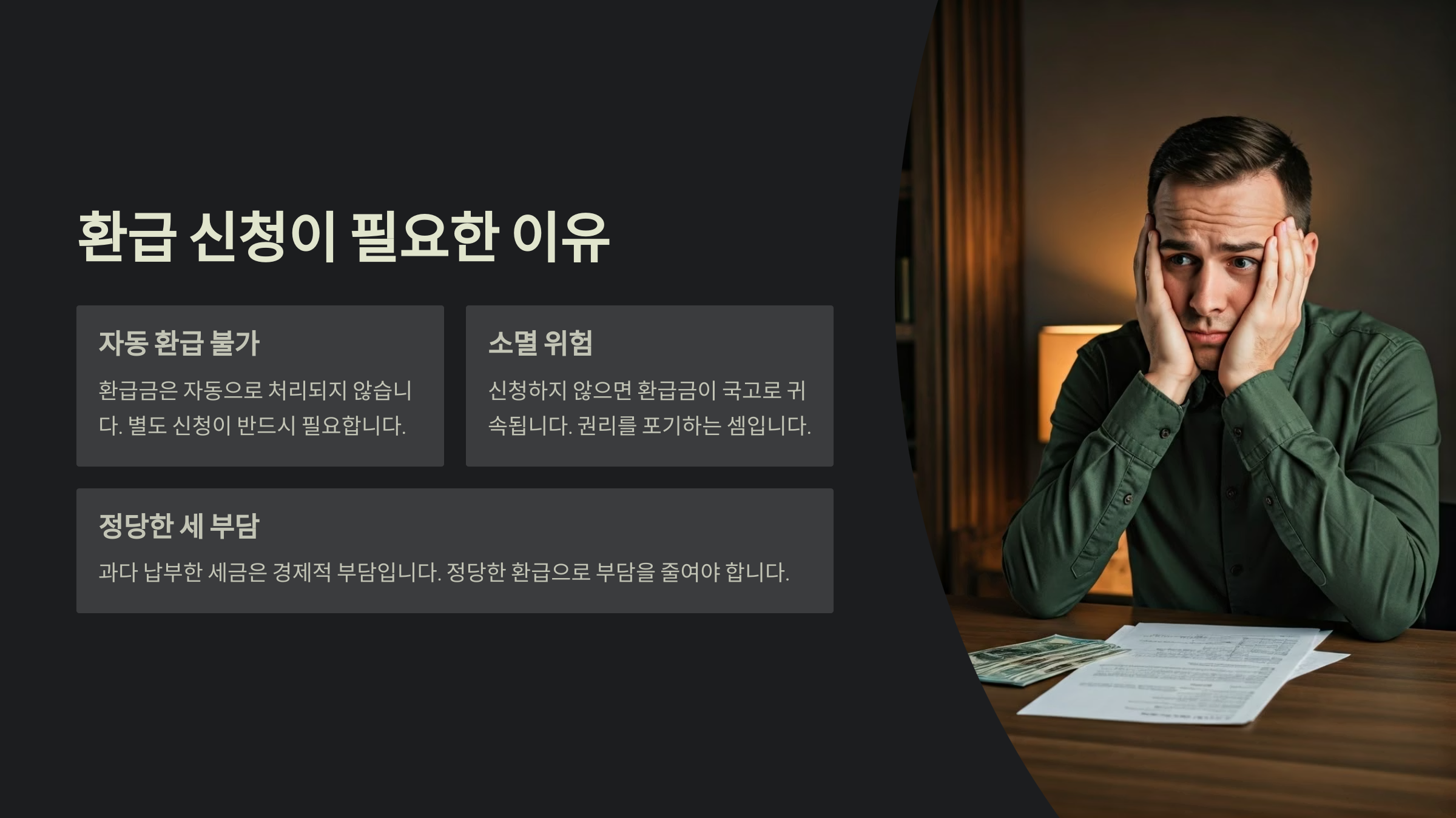 많은 분들이 착각하는 게 있어요. "환급은 알아서 들어오겠지?" 하지만 그렇지 않아요.