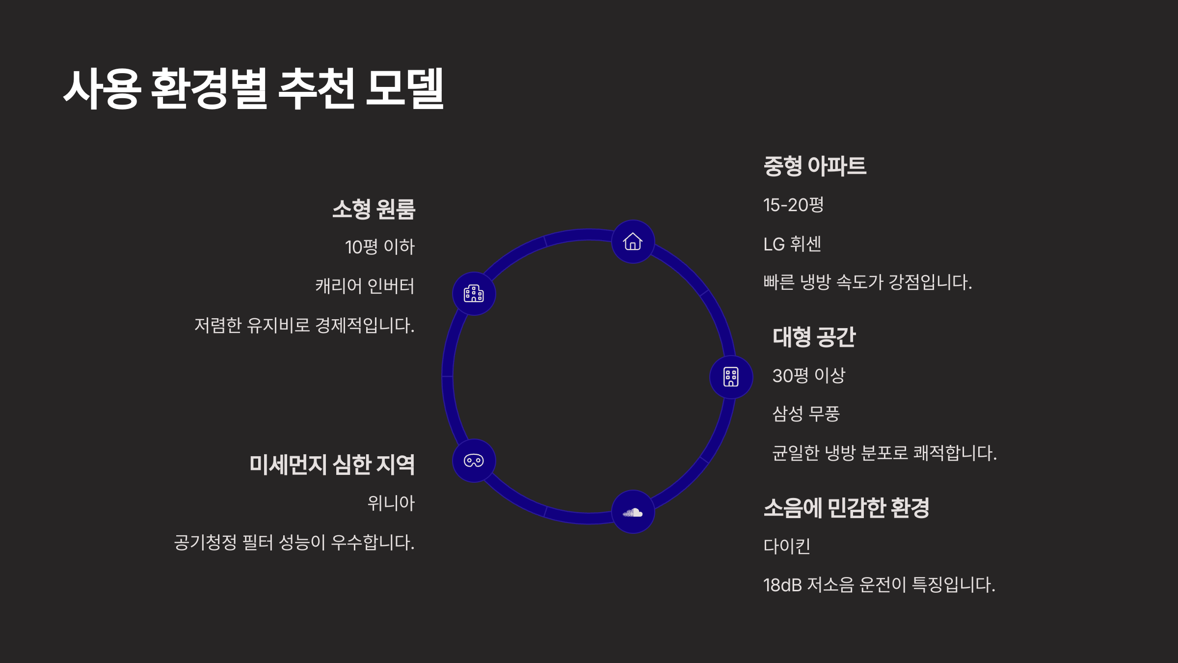 - 👨👩👧 **4인 가족 거실/안방 겸용** → 삼성 무풍 갤러리 (자동절전 + 깔끔한 디자인)