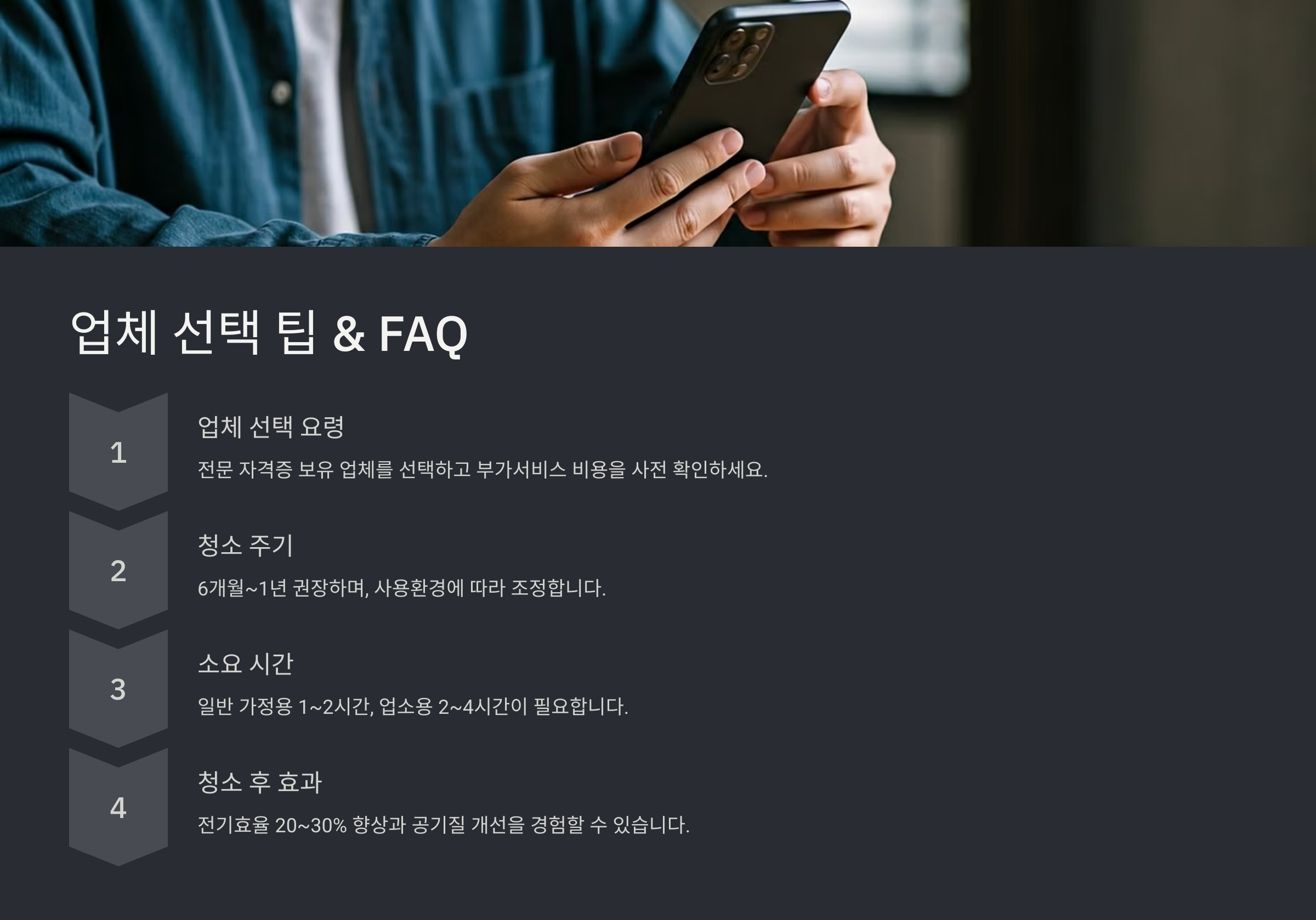 특히 곰팡이 제거, 고압세척, 팬 분해 여부는 업체마다 차이가 커요. 🔍
