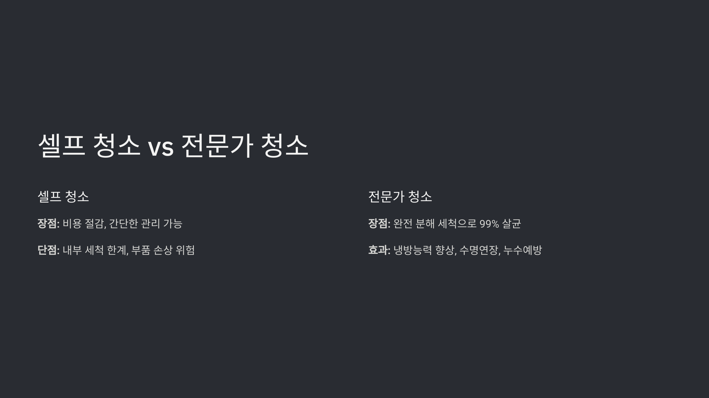 하지만 내부 송풍팬, 냉각핀, 곰팡이 세척은 고압세척기나 분해 작업이 필요한데, 이건 전문가 영역이에요.