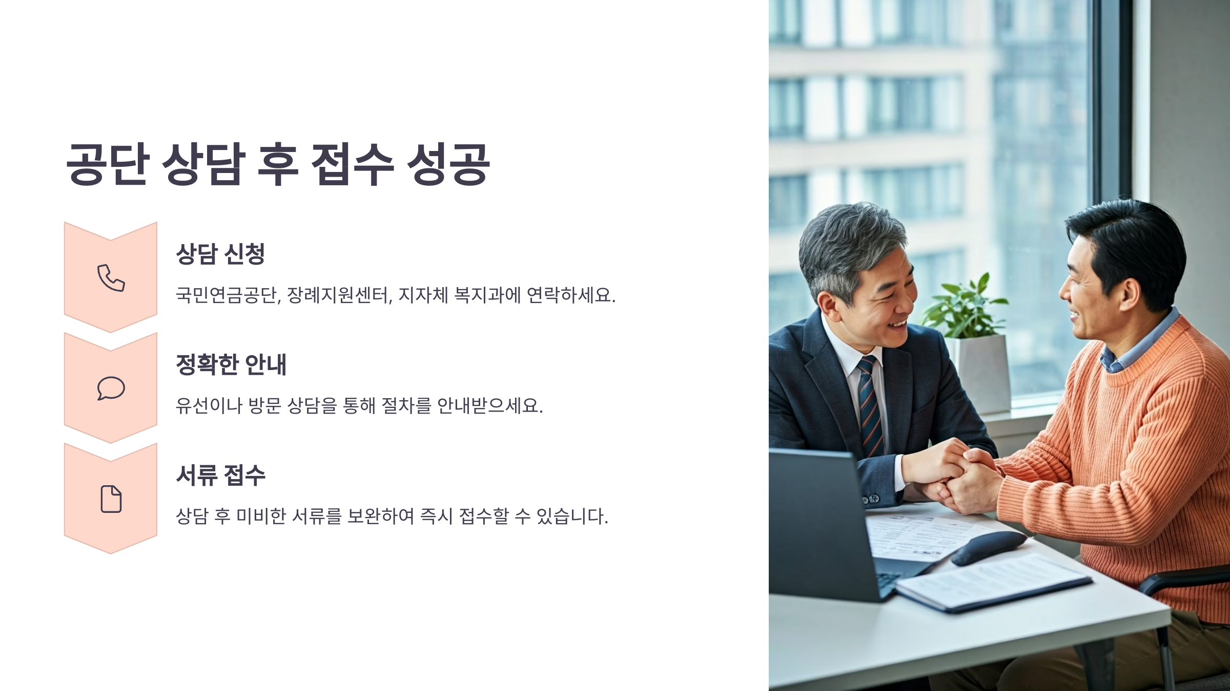 상담원은 본인 상황에 맞는 서류 목록과 주의사항을 상세히 알려줬고, 이 씨는 안내에 따라 정확히 준비해 신청했어요.