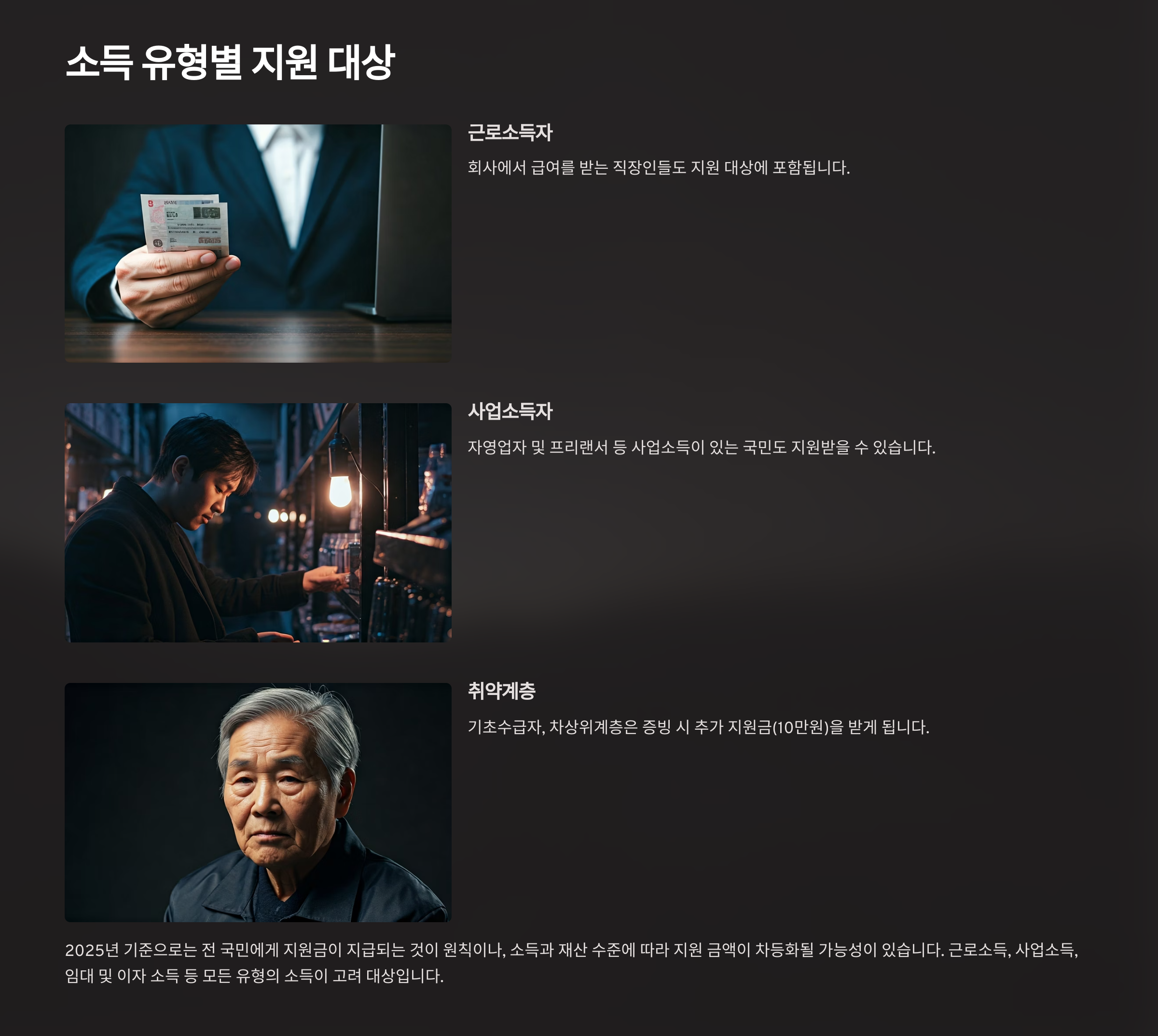 2025년에는 이런 다양한 소득 유형을 고려해서, 민생지원금 지급 시 보다 유연하게 판단하는 추세예요.