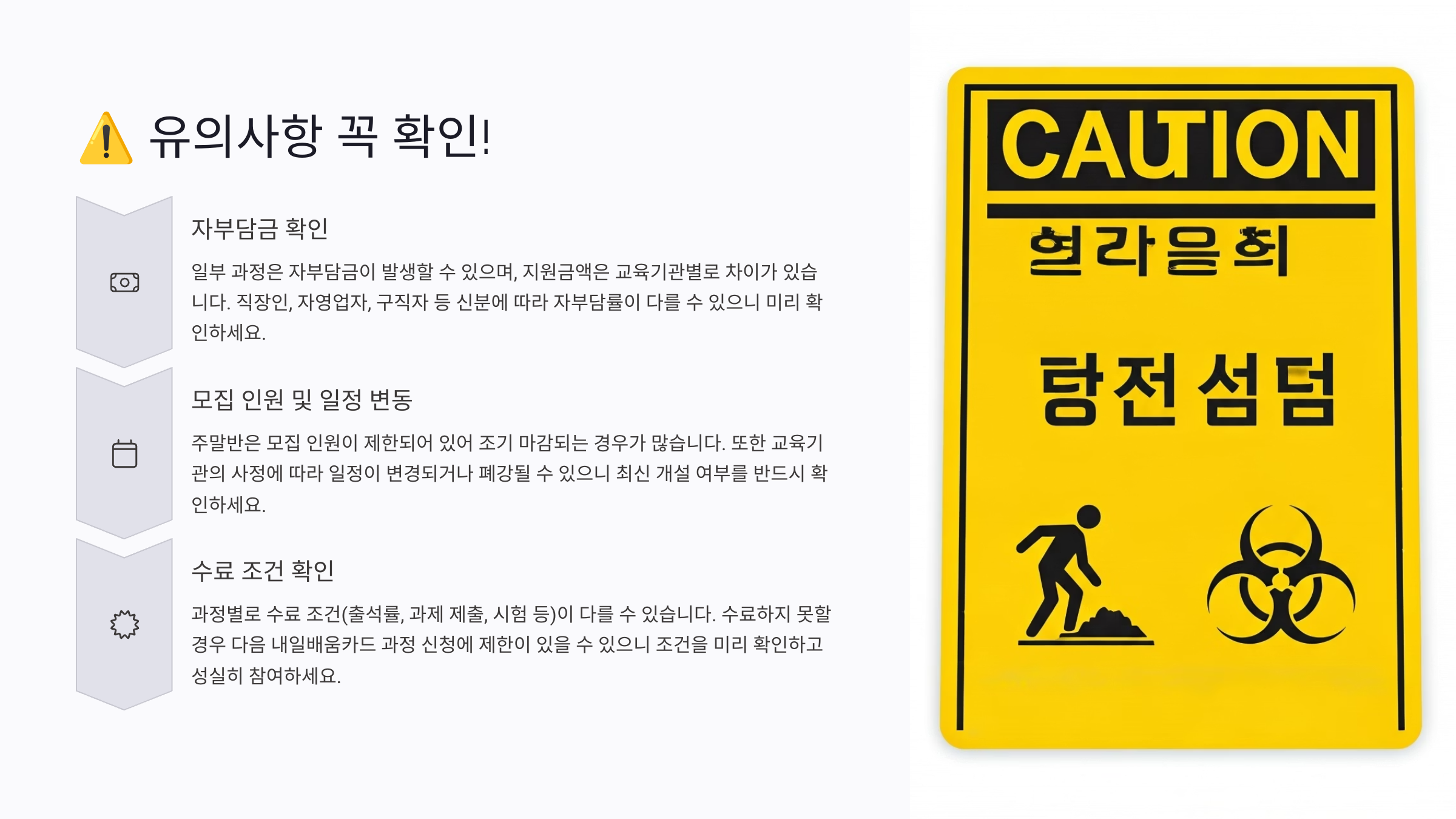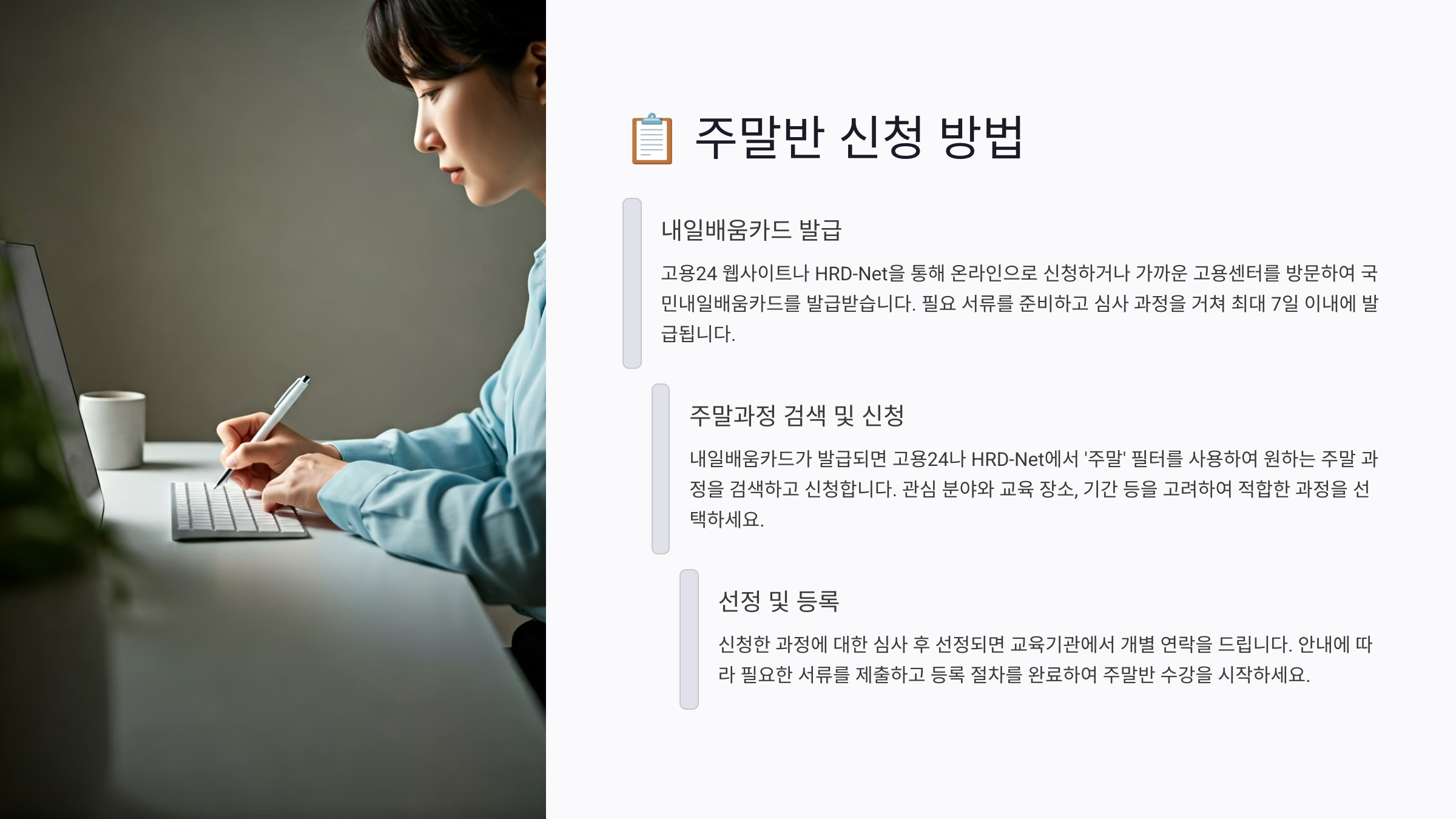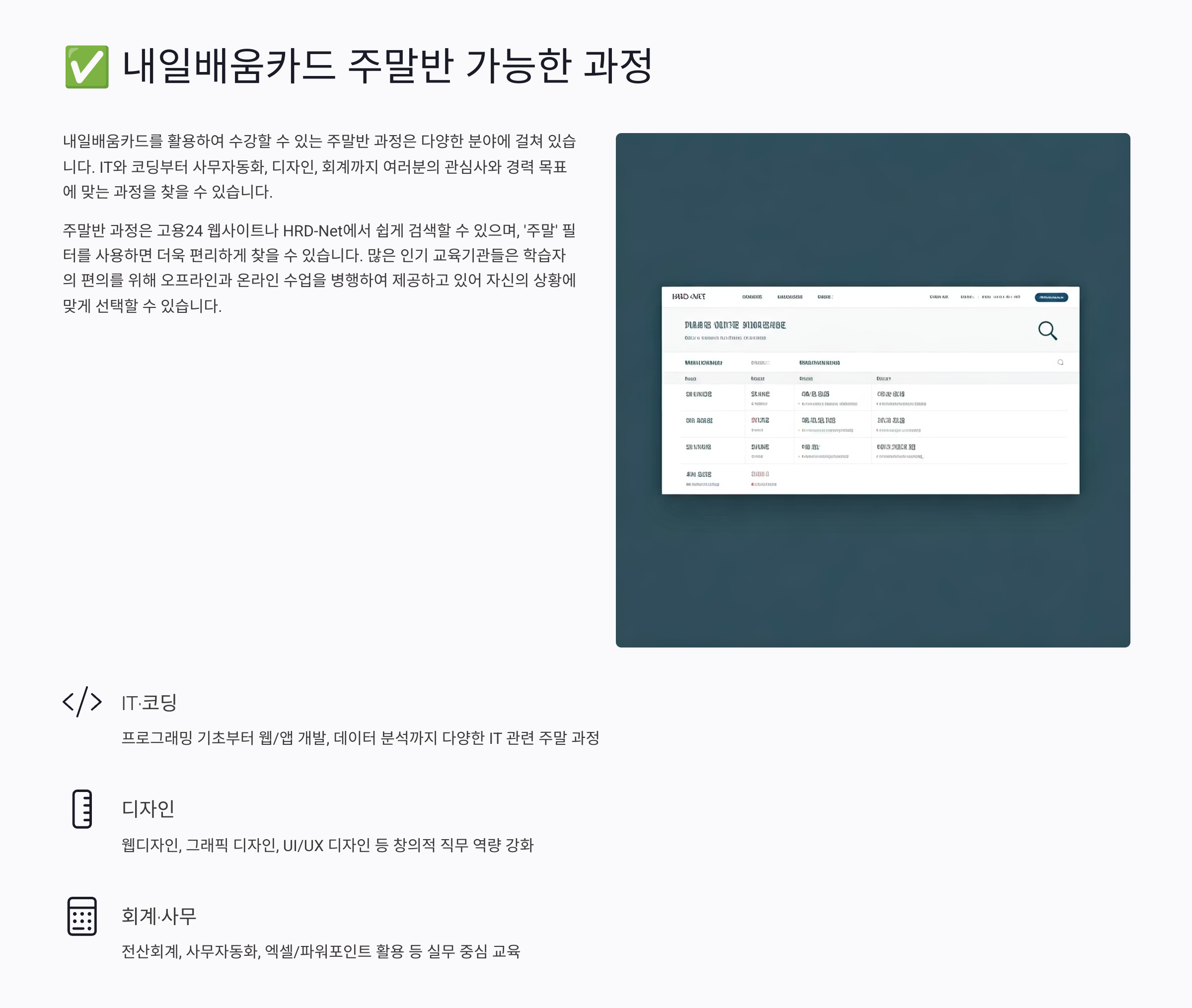 내일배움카드 주말반을 찾는 분들을 위해 어떤 과정이 가능한지, 어떻게 신청하는지, 수강 시 유의할 점까지 전부 정리해드릴게요! 📚