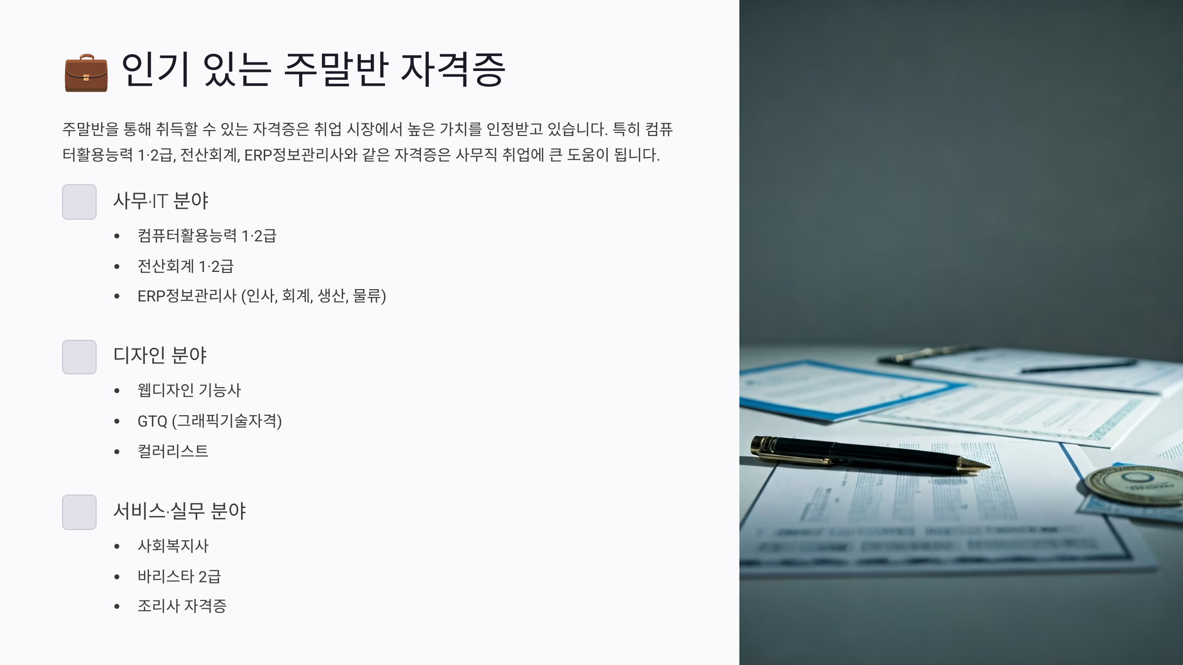 기본적으로 모든 자격증 과정 중 일부는 주말반을 따로 개설해두고 있어요. 특히 학원이나 지역센터의 유연한 운영 덕분에 선택폭이 넓어요.