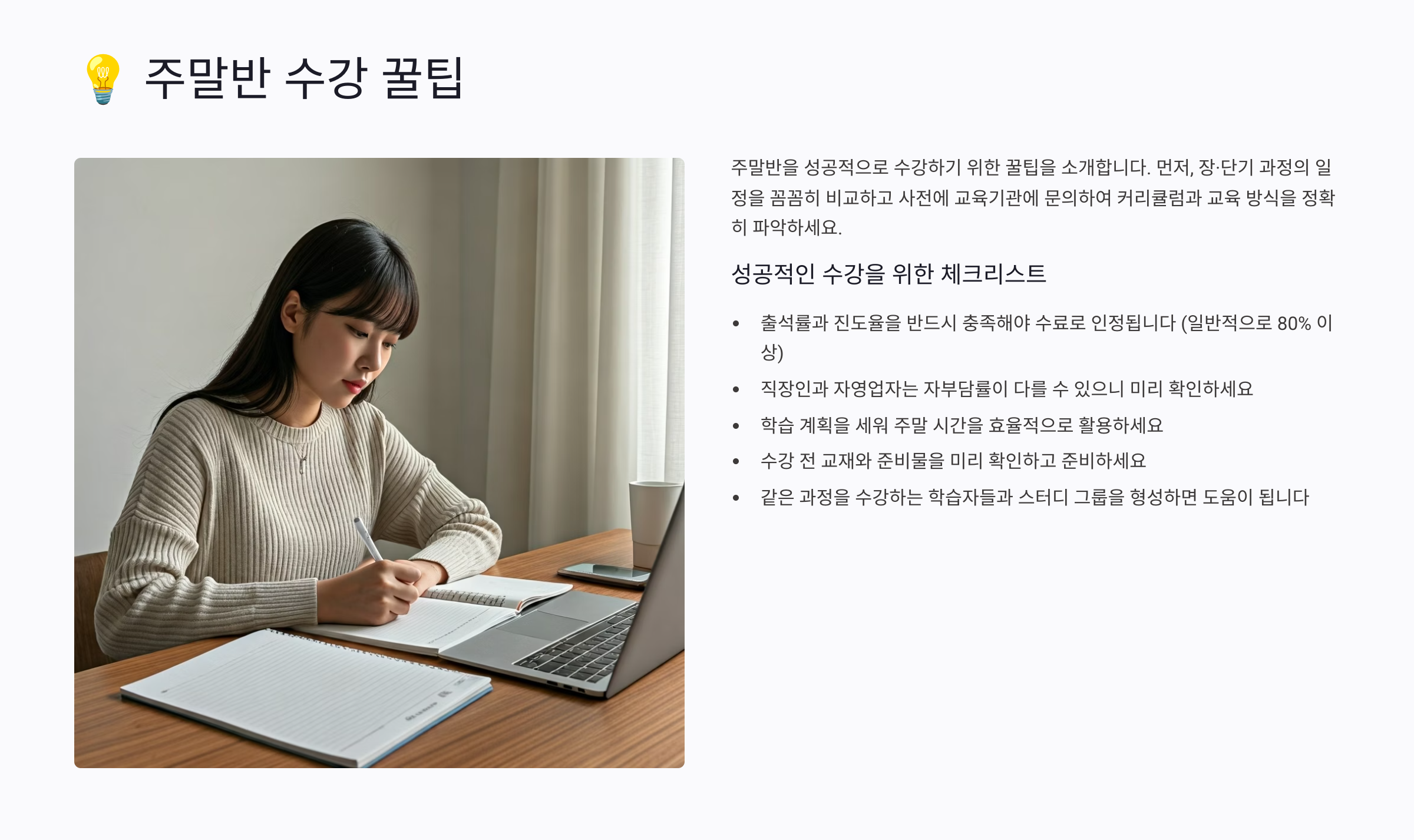 특히 내일배움카드 수강생 중 40% 이상이 주말반을 선호한다는 통계도 있어요.