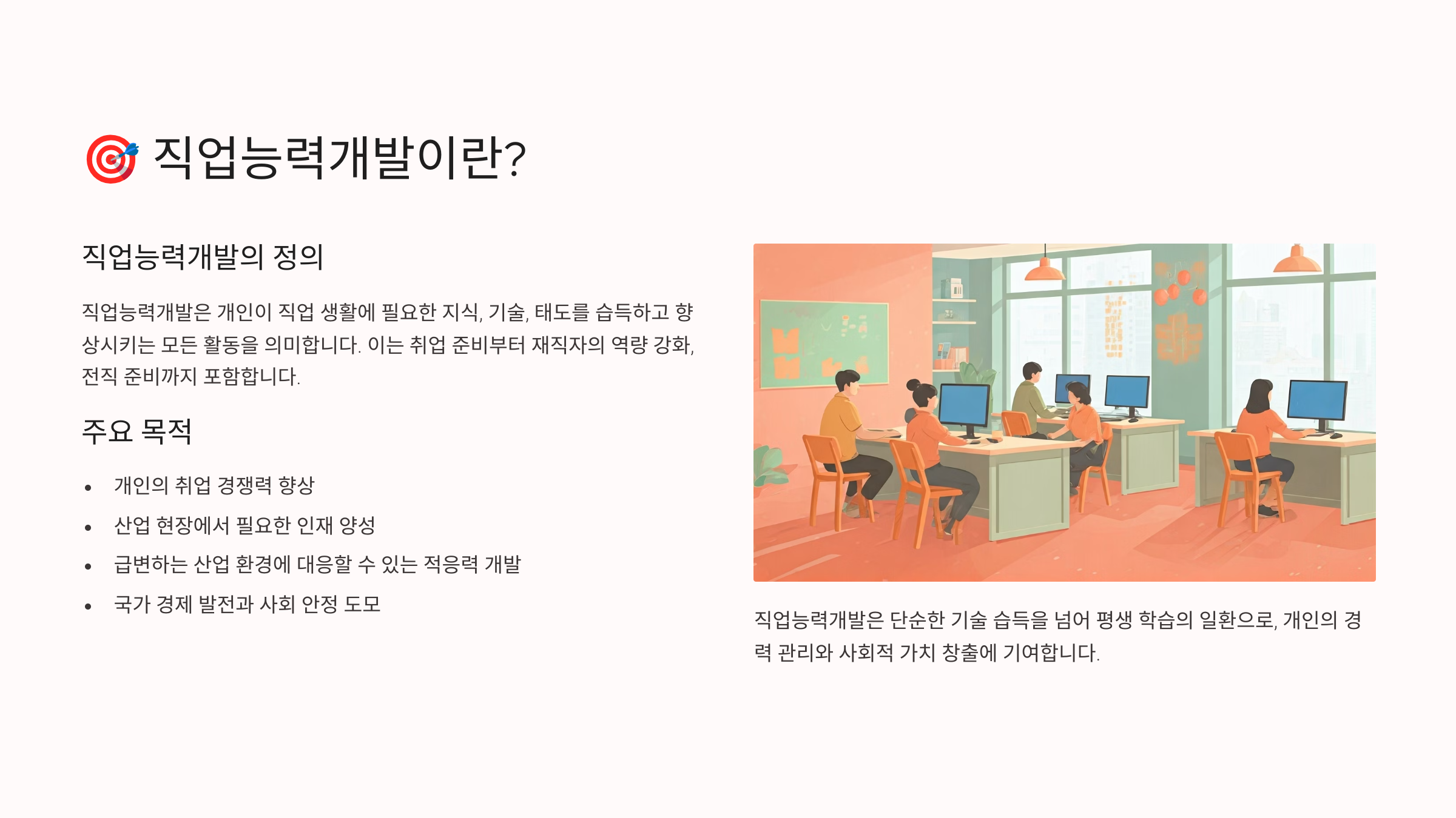 직업능력개발은 단순히 기술을 배우는 걸 넘어서 직무전환, 재취업, 창업까지 연결되는 중요한 첫걸음이에요.