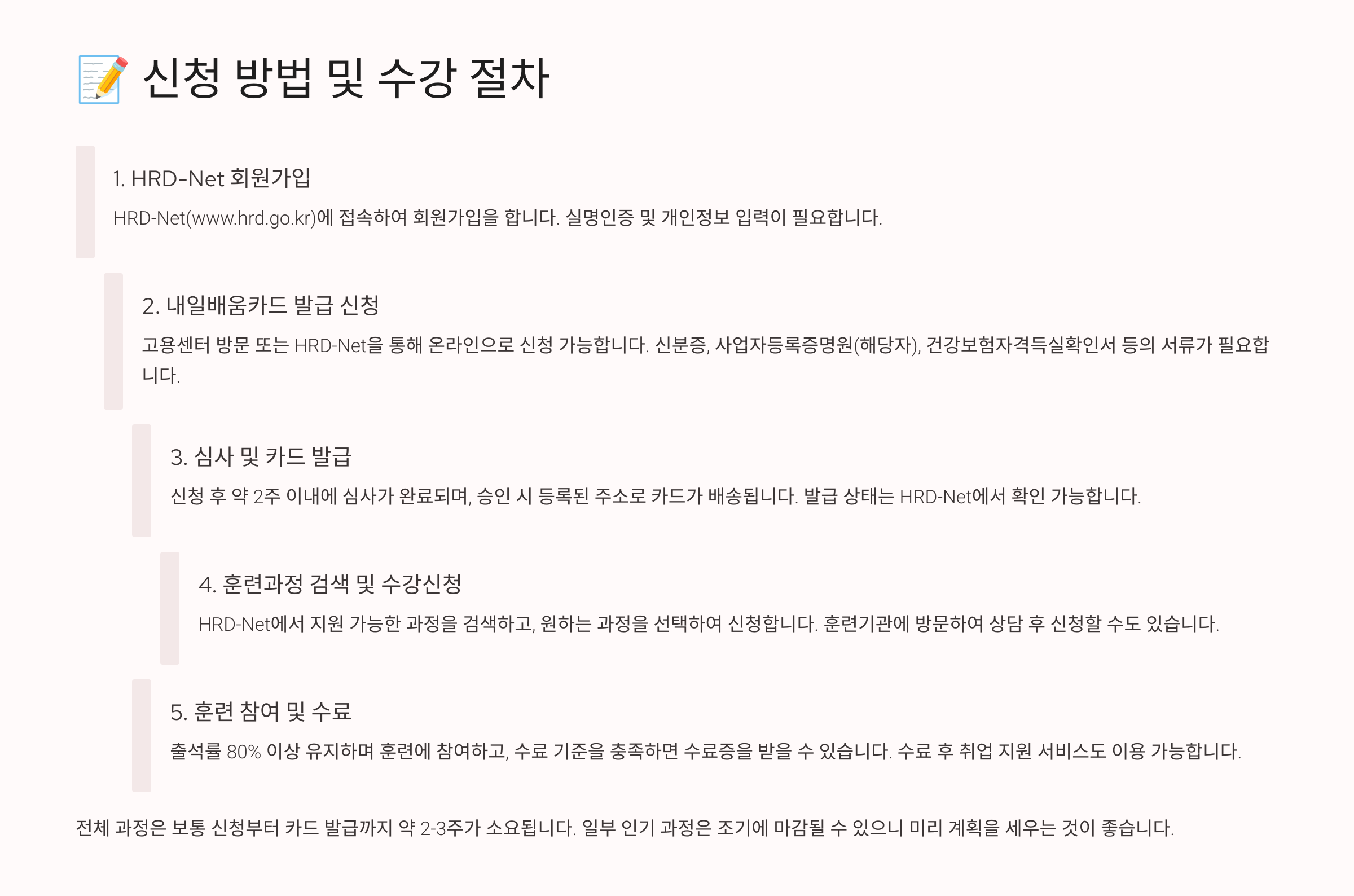 본인의 상황에 맞는 과정을 선택하는 것이 가장 중요해요. 수강신청 전 고용센터 상담 또는 HRD-Net 맞춤추천을 활용해보세요!