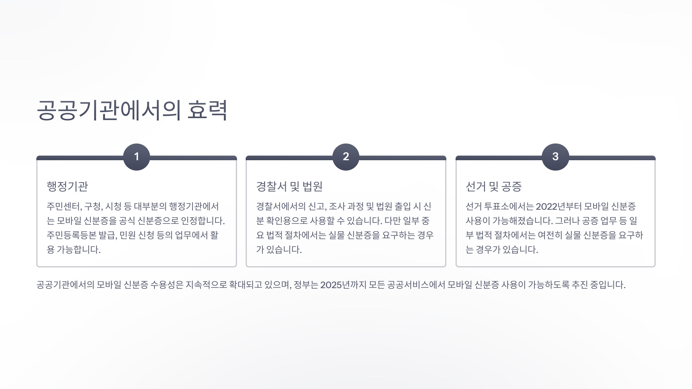 결론적으로, 모바일 신분증은 공공성과 보안성을 바탕으로 이미 제도적으로 효력이 인정되고 있고, 앞으로는 더 다양한 영역에서 실물 신분증을 대체하게 될 가능성이 높아요.