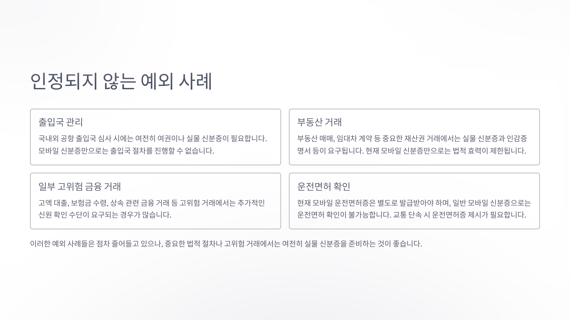 | 법원 출석 | ❌ 불인정 | 실물 신분증 필수 |