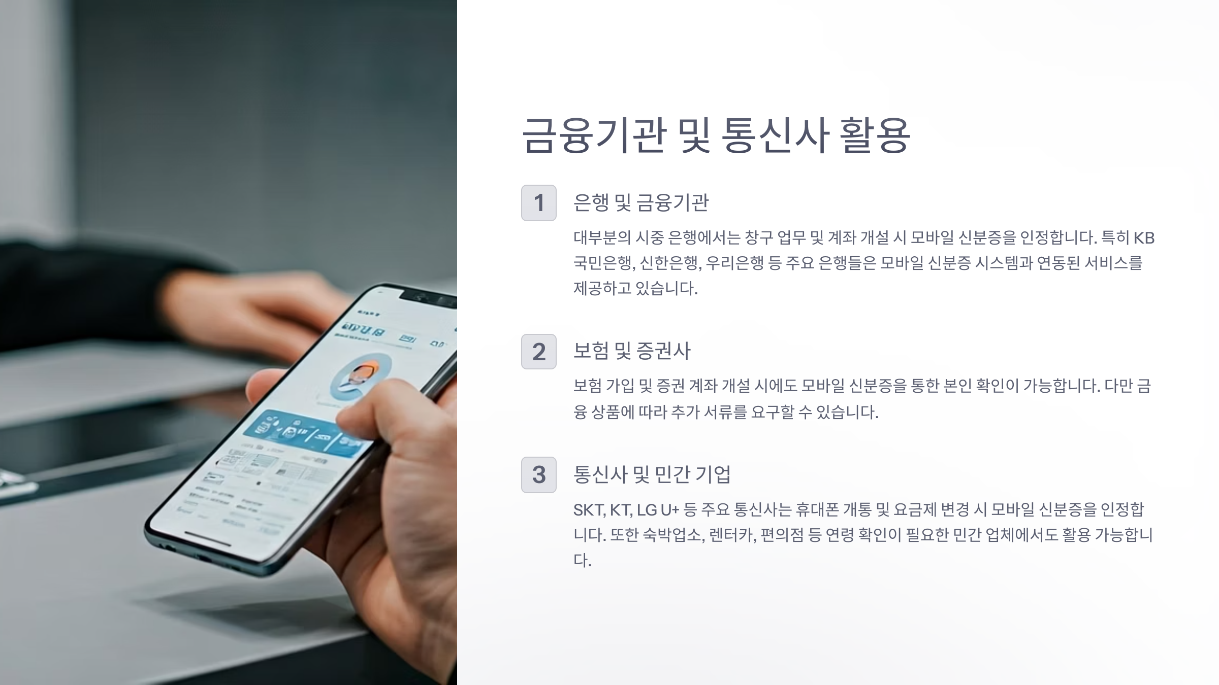 모바일 신분증은 은행이나 보험사, 통신사에서도 실제 신원확인 수단으로 널리 활용되고 있어요.