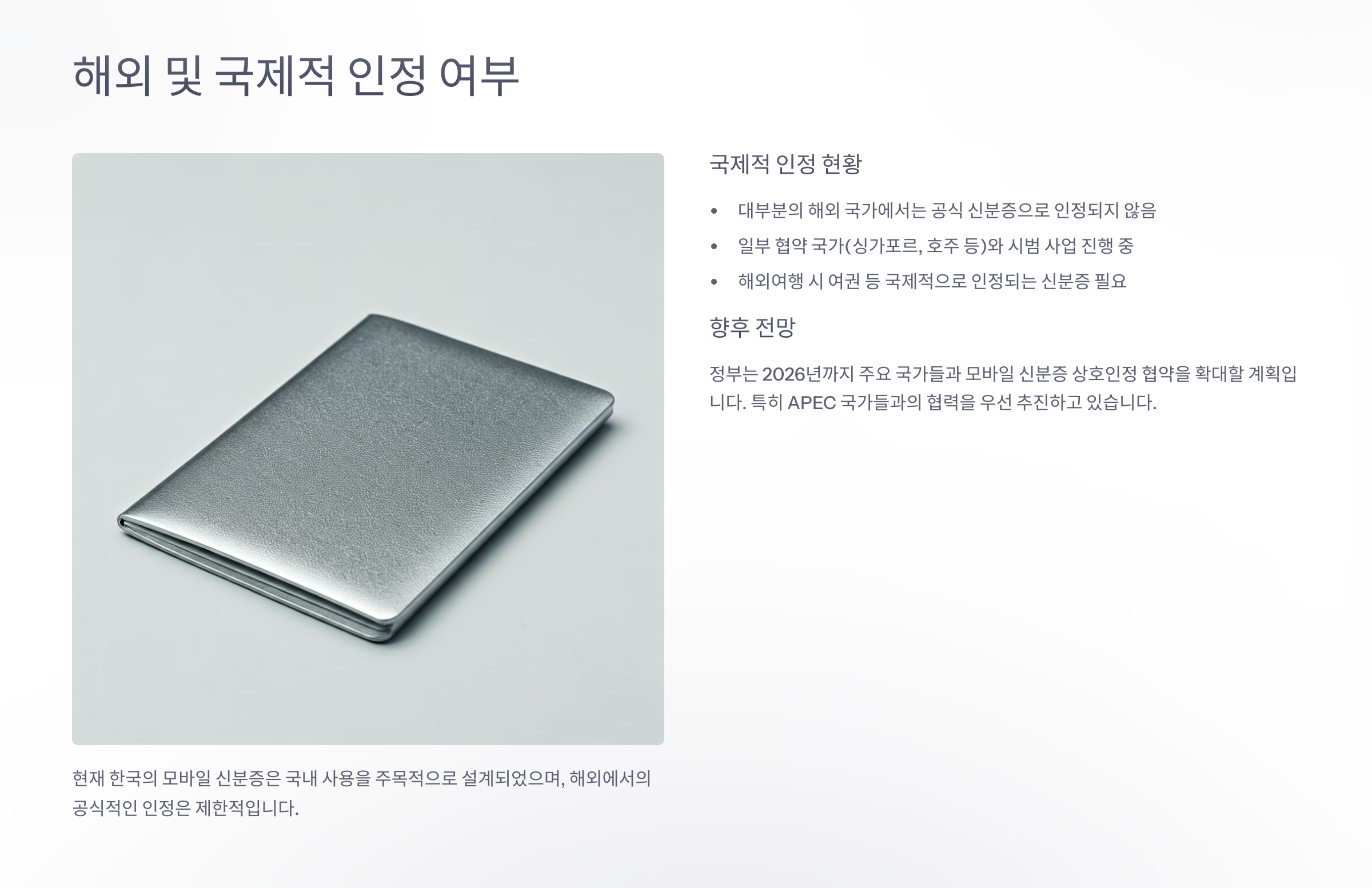 결국 해외 여행을 하거나 외국 기관에서 신원 확인이 필요할 땐, 여전히 여권이나 국제 운전면허증 등 실물 형태의 국제 공인 신분증이 필수예요.