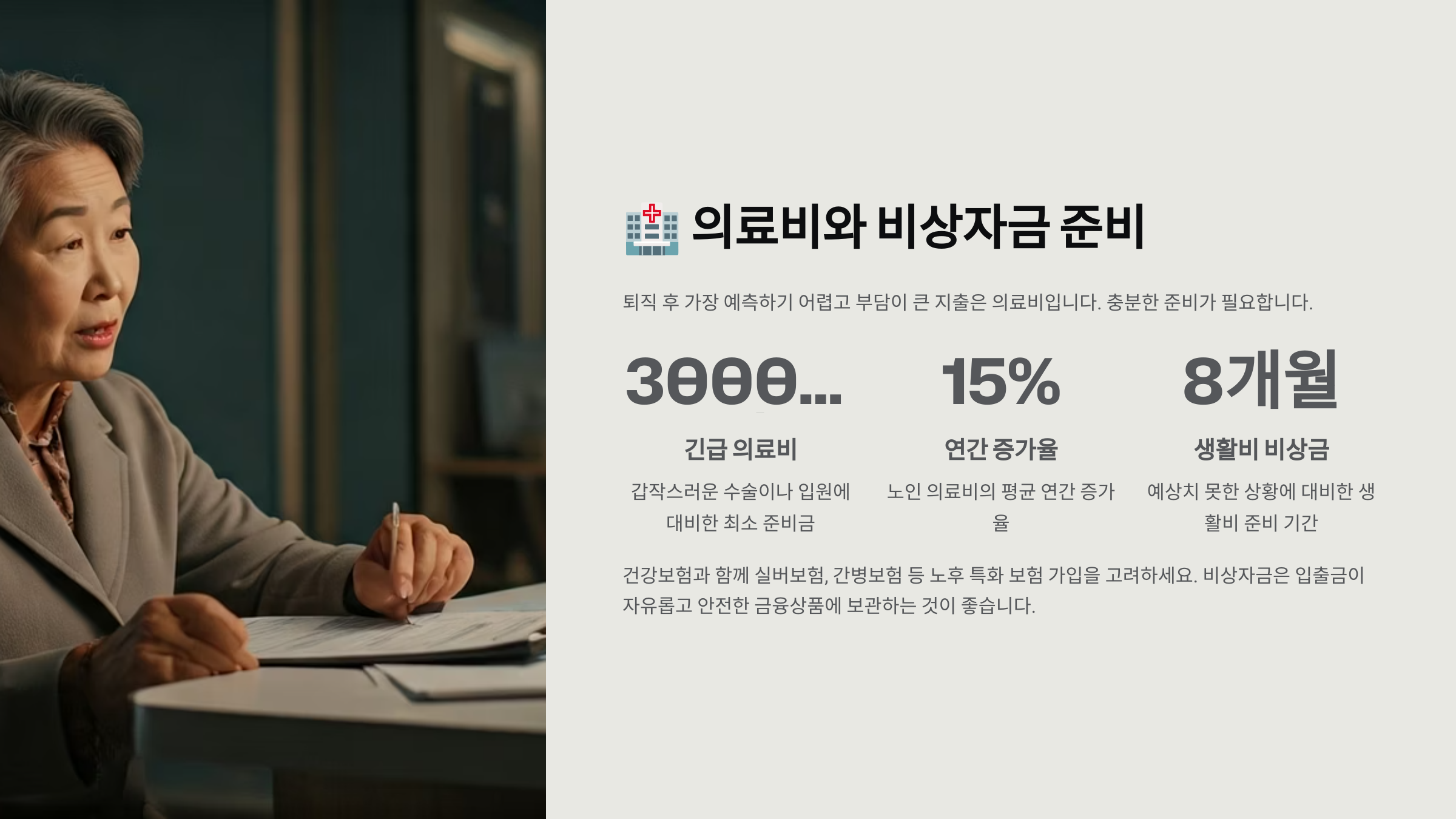 정기 수입이 없는 퇴직자에게 갑작스러운 병원비나 치료비는 재정에 큰 부담이 될 수 있어요.