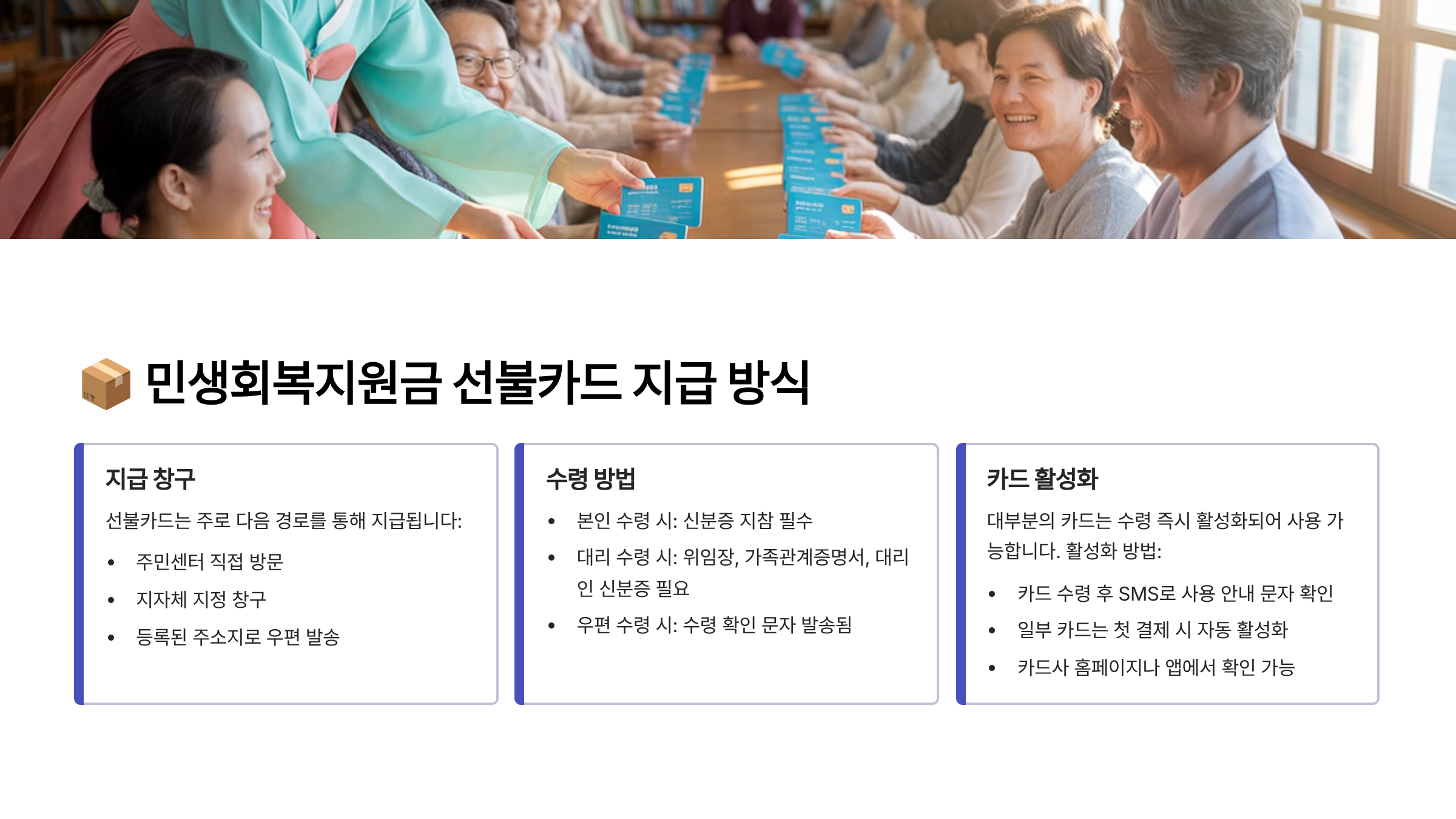 선불카드는 주민센터, 지자체 지정 창구 또는 우편을 통해 지급돼요.