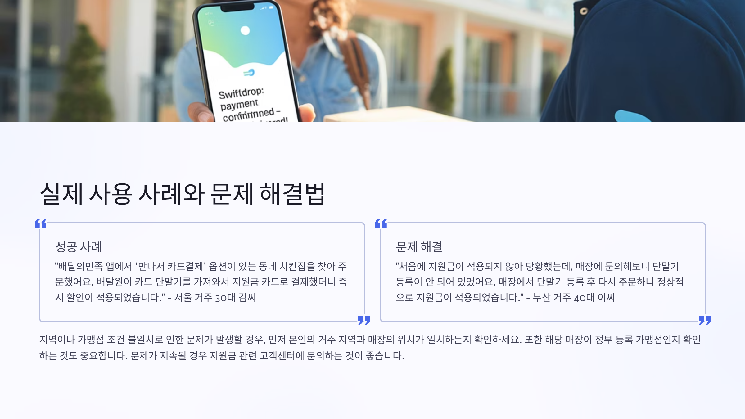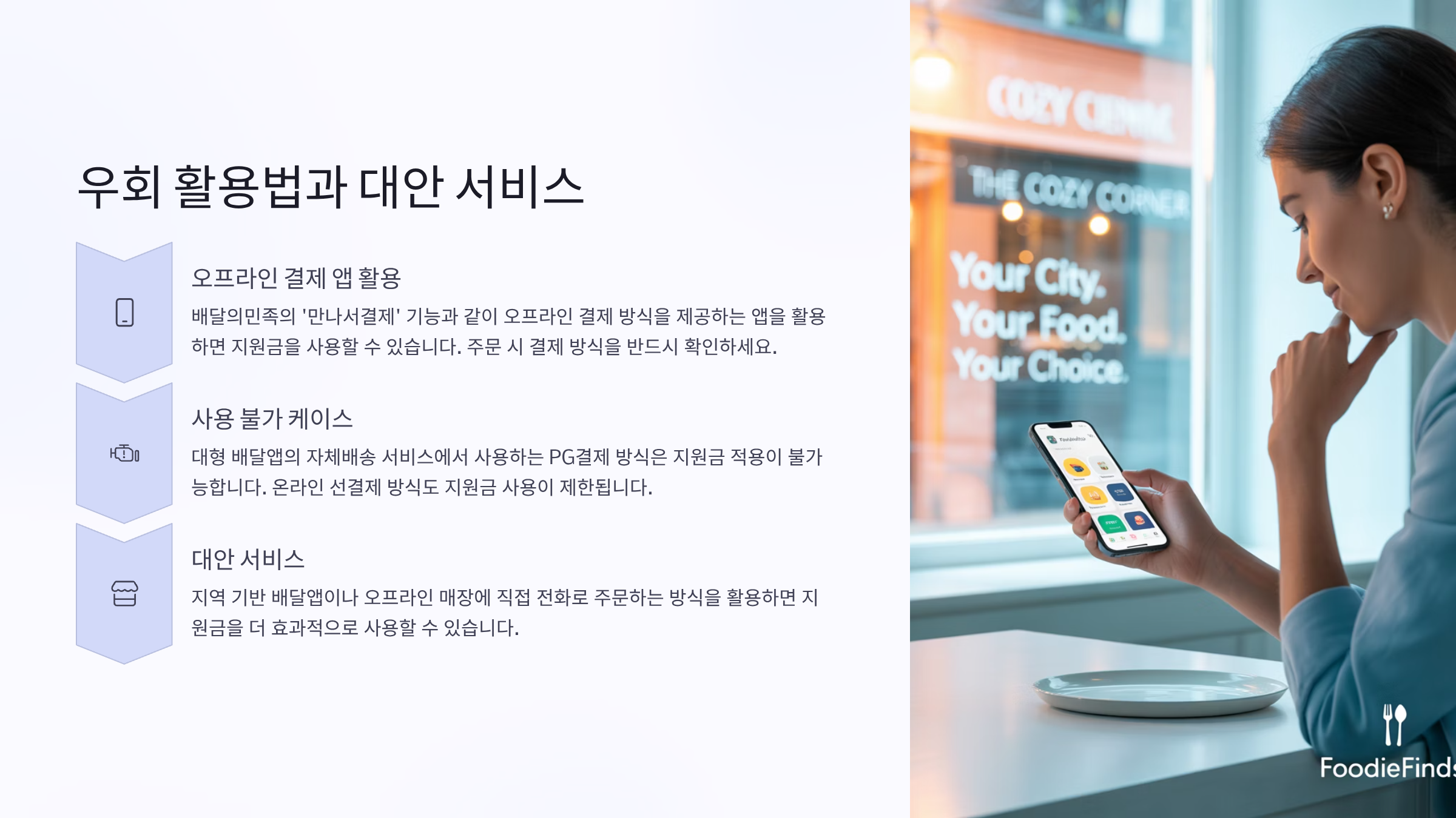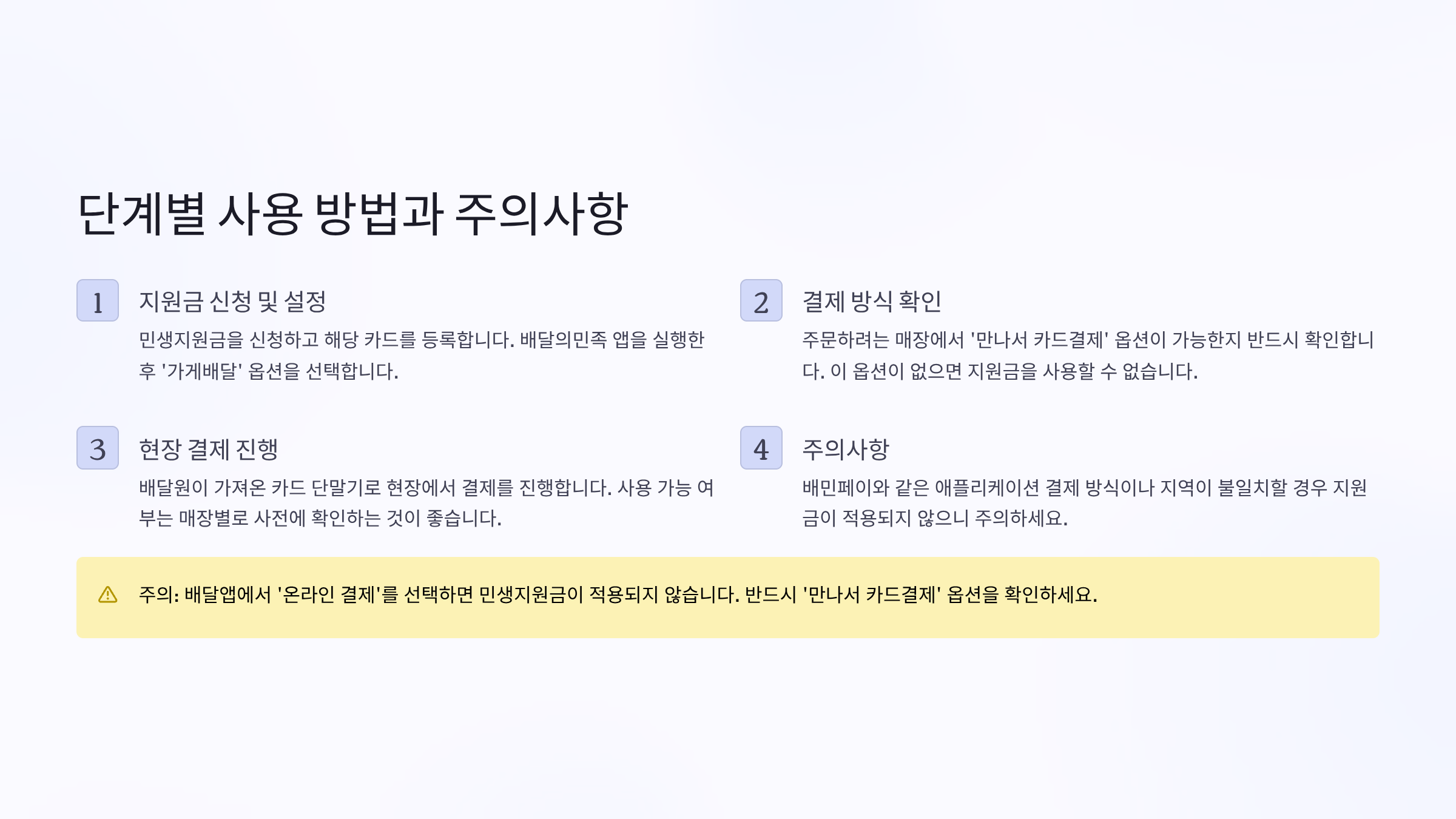 **Q1. 모든 민생회복지원금을 배달의민족에서 사용할 수 있나요?** A1. 아니요, 대부분의 지역에서는 배달앱 사용이 제한됩니다. 서울 일부 구와 경기도 일부 시에서만 제한적으로 허용하고 있으며, 이마저도 특정 조건(지역 내 가맹점, 시간대 제한 등)이 적용됩니다. 본인의 지원금 종류와 거주 지역의 정책을 먼저 확인해야 합니다. **Q2. '만나서 결제' 옵션은 모든 가맹점에서 가능한가요?** A2. 대부분의 가맹점에서 지원하지만, 일부는 현장 카드 결제를 지원하지 않을 수 있습니다. 특히 배달 대행업체를 이용하는 경우 배달원이 카드 단말기를 소지하지 않을 수 있으므로, 주문 시 메모란에 카드 결제 희망을 명시하거나 가맹점에 직접 문의하는 것이 좋습니다. **Q3. 지원금 카드를 배민페이에 등록할 수 있나요?** A3. 대부분 불가능합니다. 지원금 카드는 간편결제 서비스 등록이 차단되어 있는 경우가 많으며, 등록이 되더라도 실제 결제 시 오류가 발생합니다. 이는 부정 사용을 방지하기 위한 정책적 조치입니다. **Q4. 포장 주문 시에도 배달의민족 앱을 통해 지원금 결제가 가능한가요?** A4. 앱에서 직접 결제는 어렵지만, 포장 주문 후 매장 방문 시 지원금 카드로 결제할 수 있습니다. 배달의민족의 '포장' 탭을 활용해 메뉴를 확인하고 전화 주문 후 직접 방문하여 결제하는 방식을 추천합니다. **Q5. 다른 배달앱(요기요, 쿠팡이츠 등)에서는 사용 가능한가요?** A5. 배달의민족과 마찬가지로 대부분 제한됩니다. 오히려 배달의민족이 가장 많은 지역에서 제한적이나마 사용을 허용하고 있으며, 다른 배달앱들은 더 엄격한 제한을 두고 있는 경우가 많습니다. **Q6. 주류가 포함된 주문도 지원금으로 결제할 수 있나요?** A6. 불가능합니다. 주류와 담배는 지원금 사용 제한 품목으로, 해당 품목이 포함된 주문은 자동으로 결제가 거부됩니다. 주류를 제외한 음식만 주문하거나, 주류는 별도로 현금이나 다른 카드로 결제해야 합니다. **Q7. 지원금 사용 내역은 어디서 확인할 수 있나요?** A7. 지원금 카드 발급 기관의 홈페이지나 앱에서 확인할 수 있습니다. 또한 배달의민족 앱의 주문 내역에서도 결제 수단과 금액을 확인할 수 있습니다. 영수증은 반드시 보관하여 필요시 증빙 자료로 활용하세요. **Q8. 배달앱에서 지원금 사용이 거부되면 환불받을 수 있나요?** A8. 결제가 완료되지 않았다면 별도의 환불 절차는 필요 없습니다. 만약 결제 후 문제가 발생했다면, 배달의민족 고객센터와 지원금 발급 기관에 문의하여 해결해야 합니다. 단, 정당한 사유 없이 주문을 취소하는 것은 가맹점에 피해를 줄 수 있으므로 자제해야 합니다.