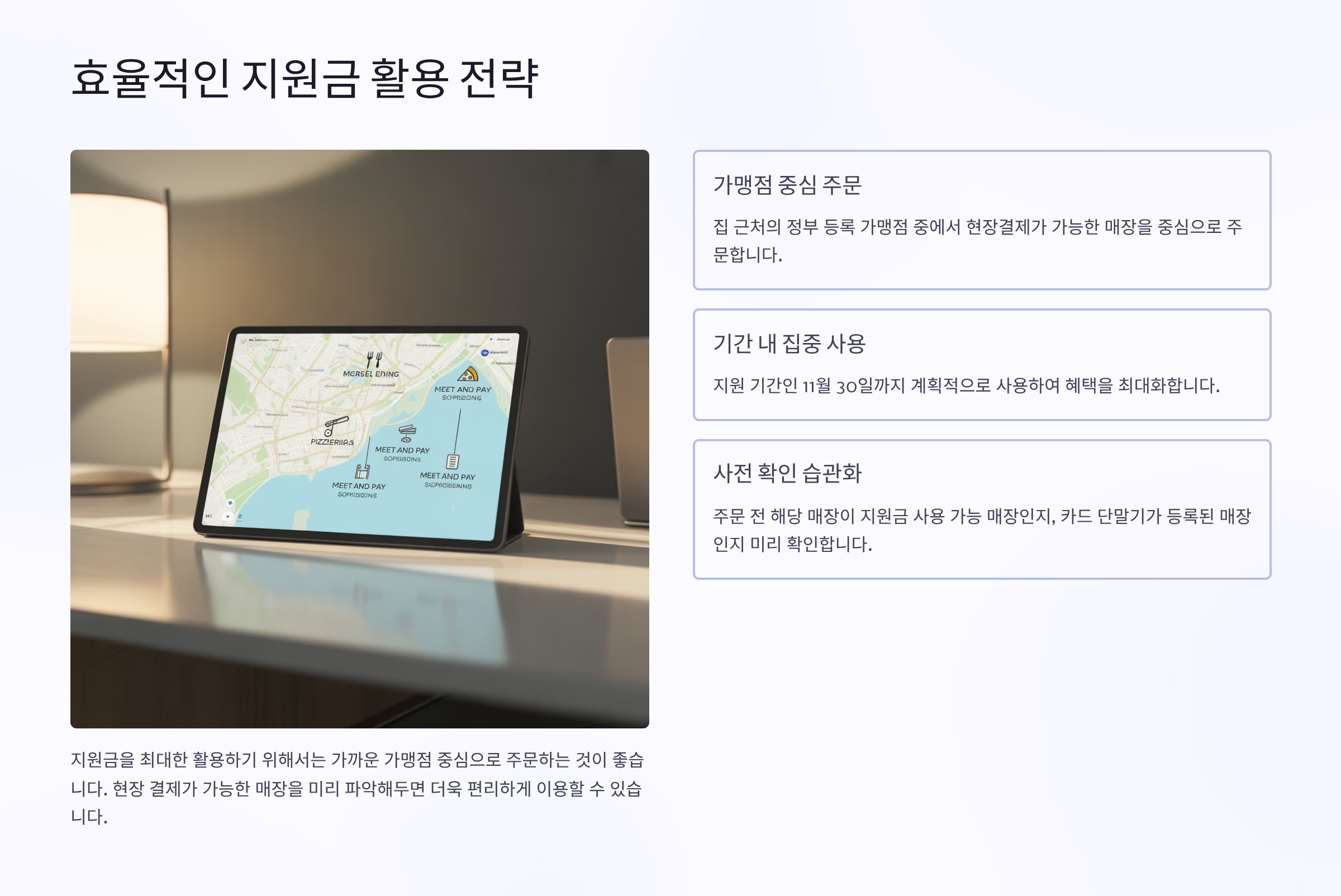 인천시 부평구의 정모씨(55세)는 기술적인 문제를 해결한 경험을 들려주었습니다. "배달의민족 앱에서 계속 '결제 오류'가 발생해서 고객센터에 문의했더니, 지원금 카드의 온라인 결제 기능을 활성화해야 한다고 하더군요. 카드사에 전화해서 활성화 요청을 했지만, 정책상 불가능하다는 답변을 받았습니다. 결국 현장 결제 방식으로 해결했지만, 처음부터 명확한 안내가 있었다면 좋았을 텐데 하는 아쉬움이 있었어요." 광주시 서구의 김모씨(26세)는 창의적인 활용 방법을 소개했습니다. "저는 1인 가구라 배달 최소 주문 금액을 맞추기 어려웠어요. 그래서 동네 원룸 단톡방에서 공동 주문을 제안했더니 반응이 좋았습니다. 매주 금요일 저녁에 5-6명이 모여 주문하고, 각자 지원금으로 결제해요. 배달비도 n분의 1로 나누니 부담이 없고, 이웃들과 친해지는 계기도 되었습니다." 이러한 공동체 활용 사례는 다른 지역에서도 참고할 만합니다.
