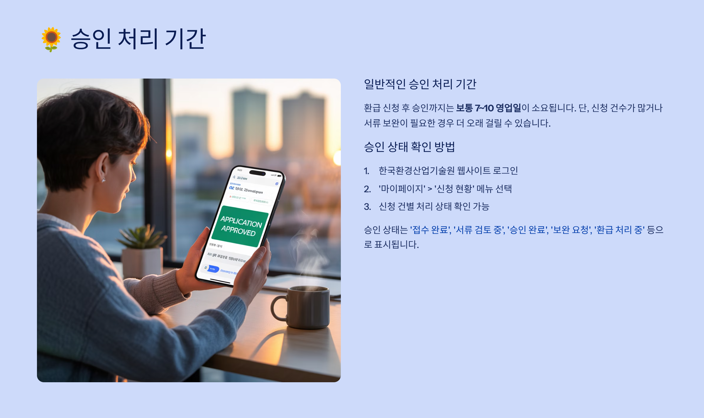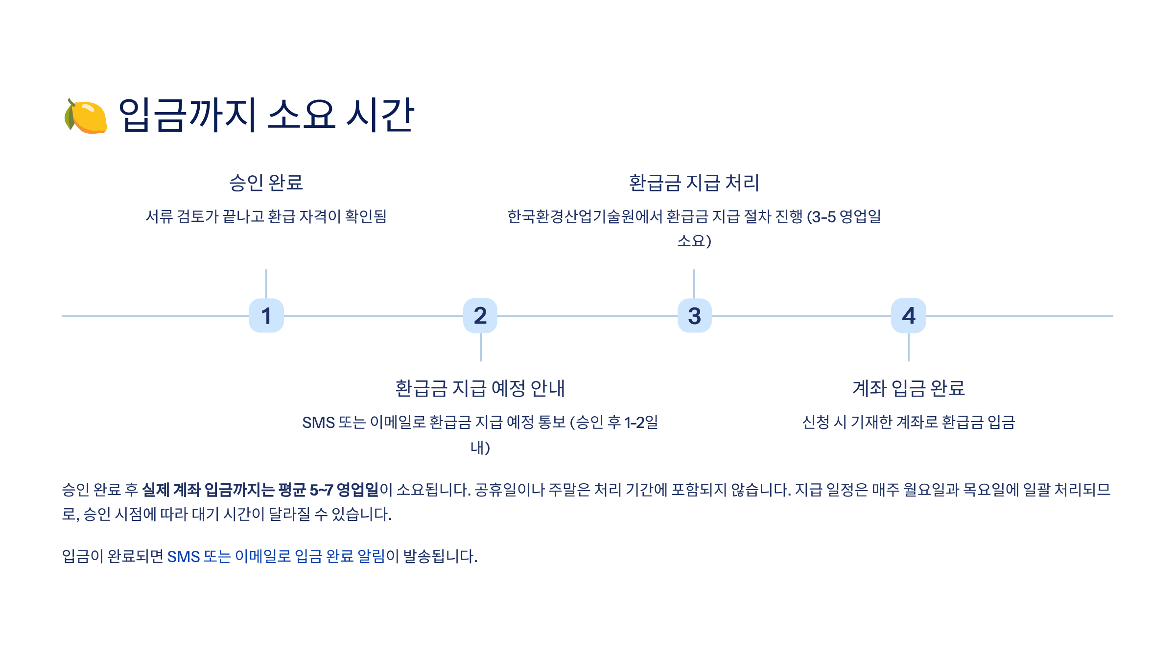 환급 승인이 완료된 후 실제 입금까지는 보통 3-5 영업일이 소요됩니다. 이는 금융기관의 처리 시간과 한국환경산업기술원의 지급 일정에 따라 달라질 수 있습니다. 대부분의 경우 승인 후 3일 이내에 입금이 완료되지만, 주말이나 공휴일이 포함된 경우 조금 더 시간이 걸릴 수 있습니다.