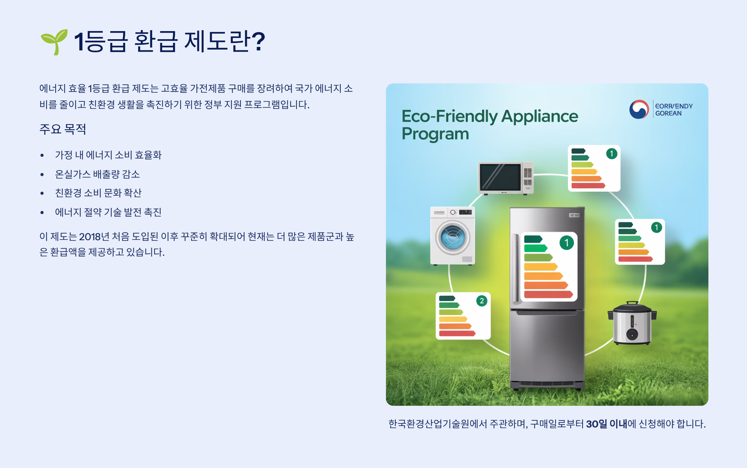 에너지 효율 1등급 환급 제도는 정부가 에너지 절약과 온실가스 감축을 위해 시행하는 대표적인 친환경 정책입니다. 소비자가 에너지 효율이 높은 1등급 가전제품을 구매할 경우, 구매 금액의 일정 비율을 환급해주는 제도로, 2009년부터 시작되어 현재까지 지속적으로 운영되고 있습니다.
