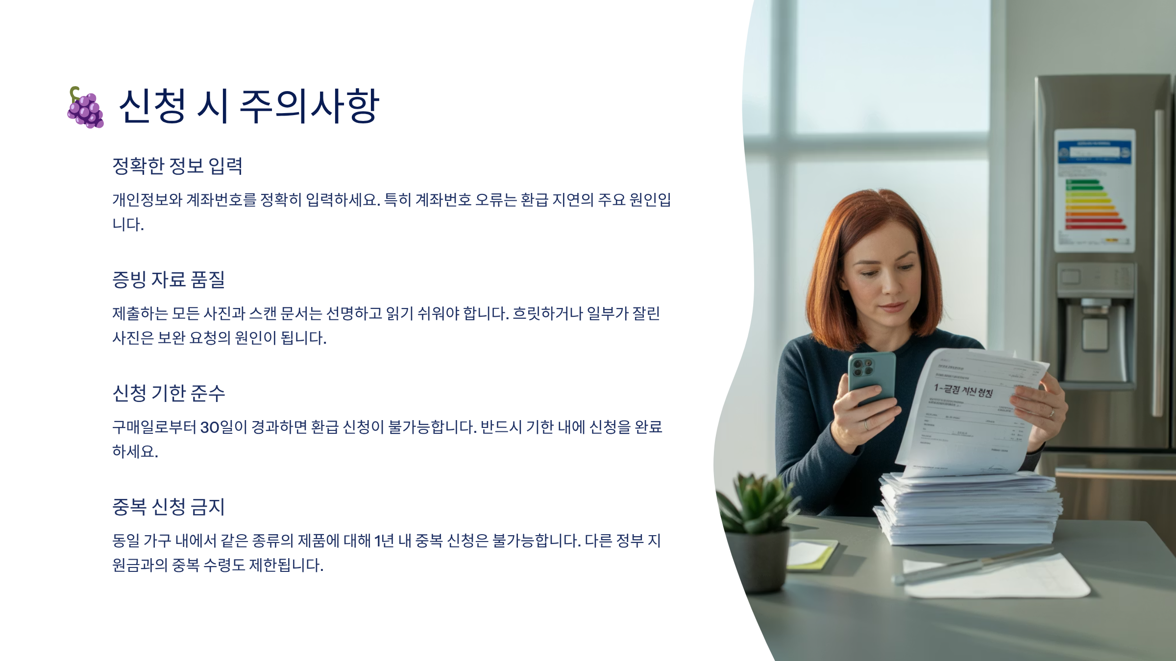 세 번째는 중복 신청에 대한 주의입니다. 동일한 제품으로 여러 번 신청하거나, 가족 명의로 나누어 신청하는 것은 부정 신청으로 간주될 수 있습니다. 적발 시 환급금 회수는 물론 향후 신청 자격이 제한될 수 있으므로 정직하게 신청해야 합니다.
