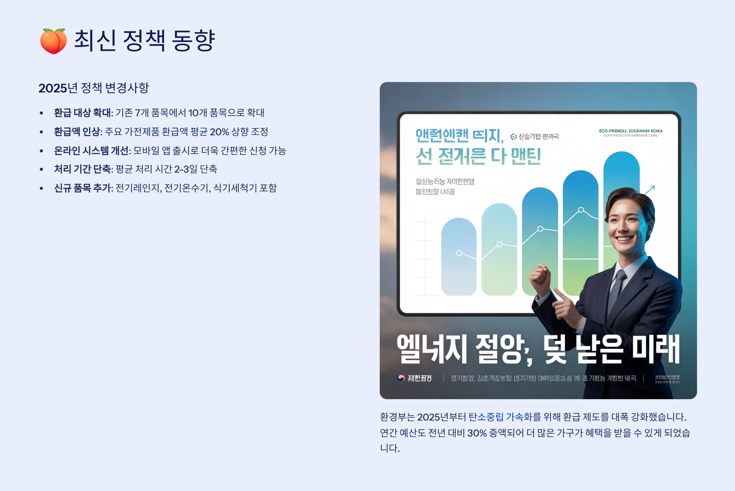 2025년 들어 정부는 탄소중립 목표 달성을 위해 에너지 효율 환급 제도를 더욱 강화하고 있습니다. 특히 주목할 만한 변화는 환급 대상 품목의 확대와 환급률 인상입니다. 기존에는 대형가전 위주였던 환급 대상이 소형가전과 IT 기기까지 확대될 예정입니다.
