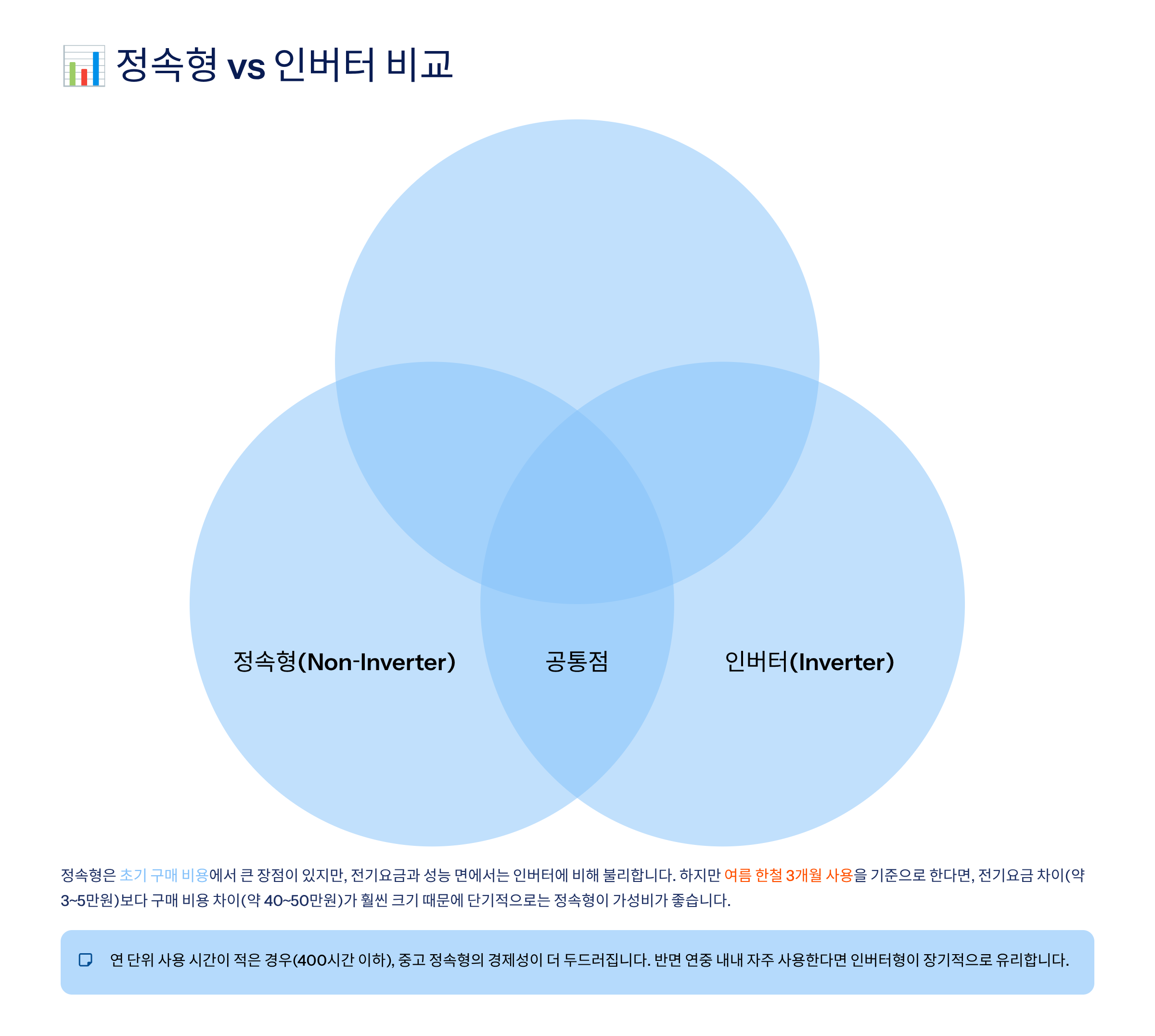 두 타입의 핵심 차이는 전력 제어 방식과 사용 패턴에 따라 달라지는 총비용이에요. 여름 한철 단기·간헐 사용은 정속형이 유리하고, 연속 가동 시간과 사용 철수가 늘어날수록 인버터의 효율이 빛나요.