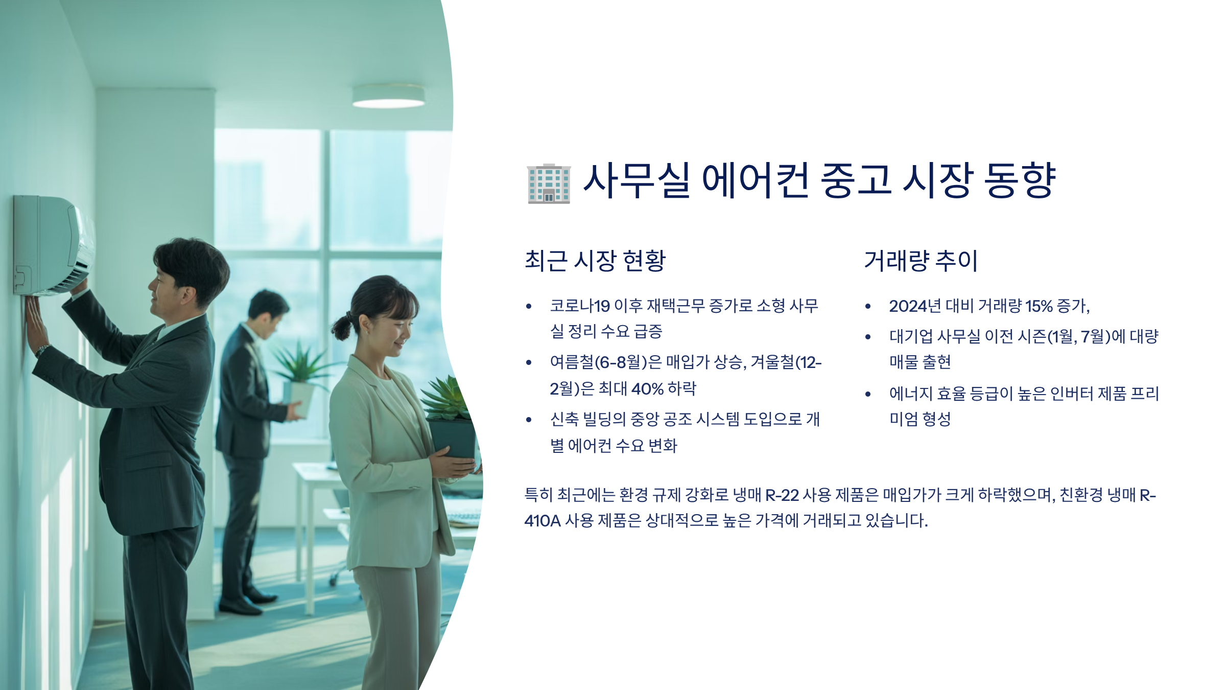 사무실 에어컨은 가정용보다 대형 제품이 많고, 설치·철거 비용이 크기 때문에 중고 거래 시장에서도 활발히 움직이고 있어요.