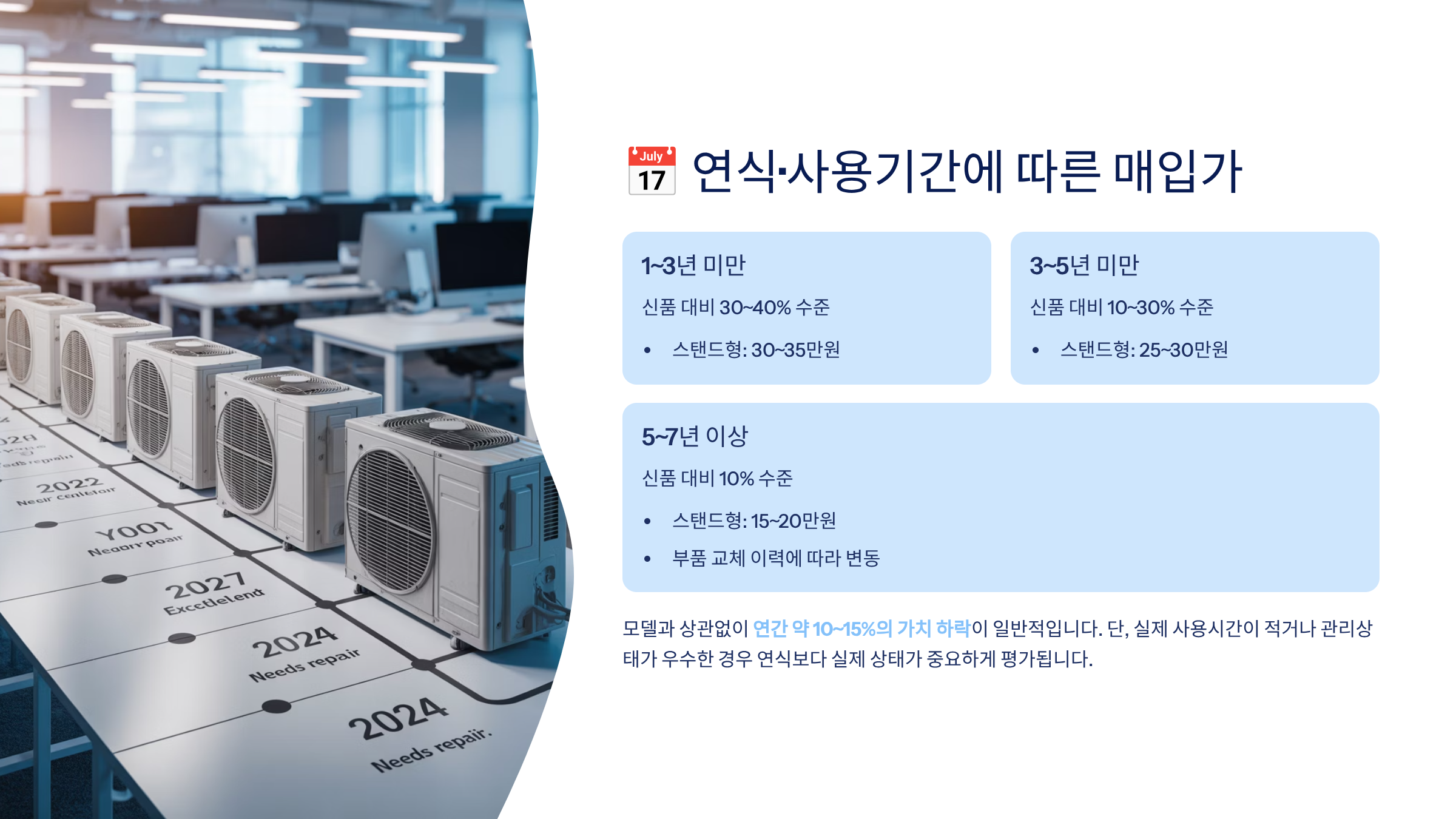 사무실 에어컨은 연식에 따라 가격 차이가 크기 때문에, 몇 년 사용했는지가 매입가의 핵심 요소예요.