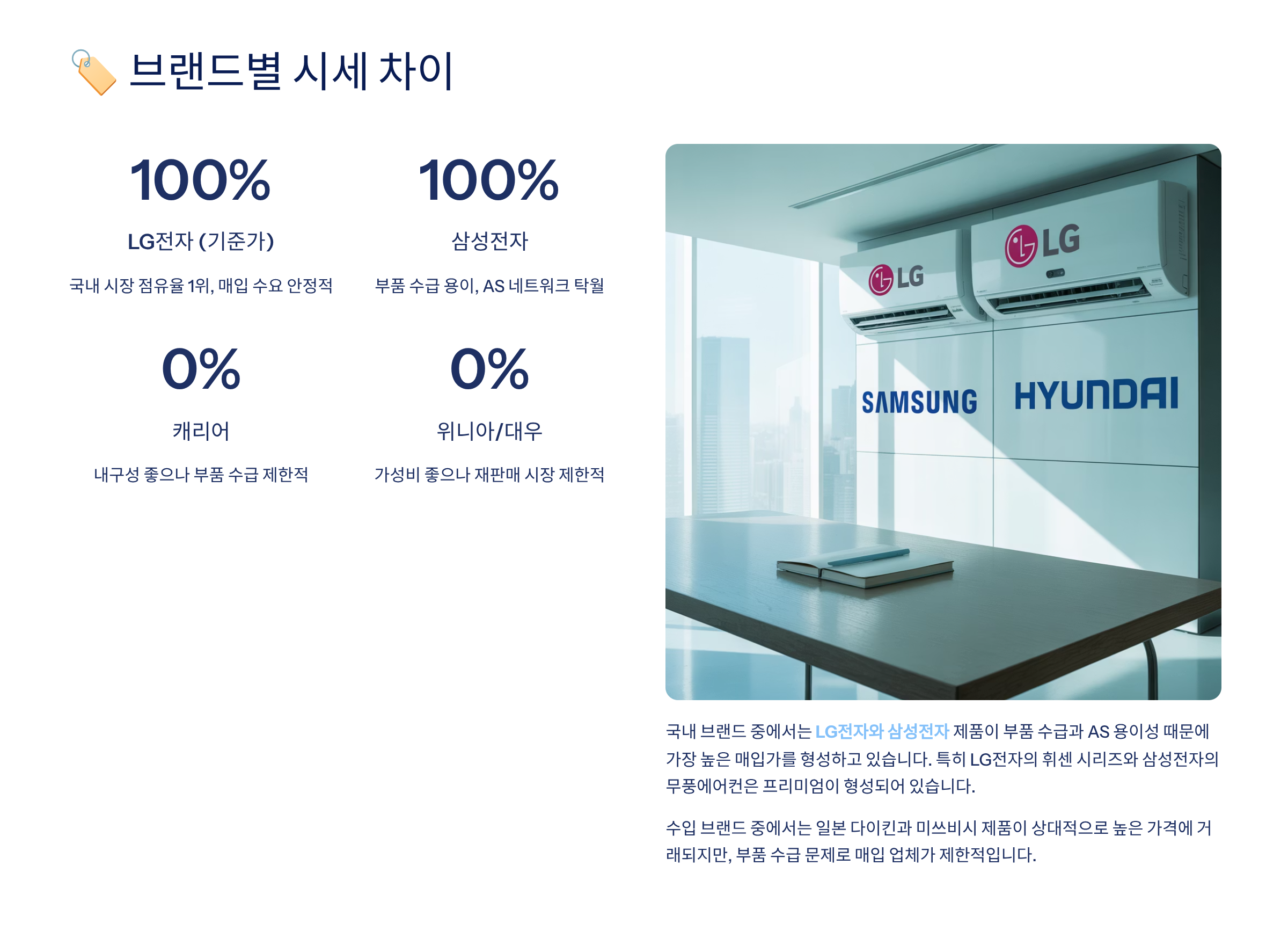 👉 삼성·LG는 매입가가 높게 형성되지만, 캐리어·위니아는 합리적 가격과 안정적인 수요로 거래가 꾸준히 이어져요.