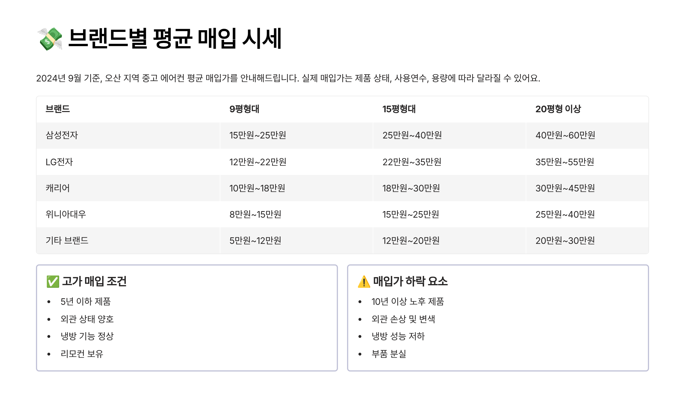 중고에어컨 매입가는 사용 연도, 브랜드, 실외기 포함 여부에 따라 달라져요. 특히 여름철 오산 지역에서는 삼성 무풍과 LG 휘센에 대한 선호도가 높고, 가격도 높게 책정돼요.