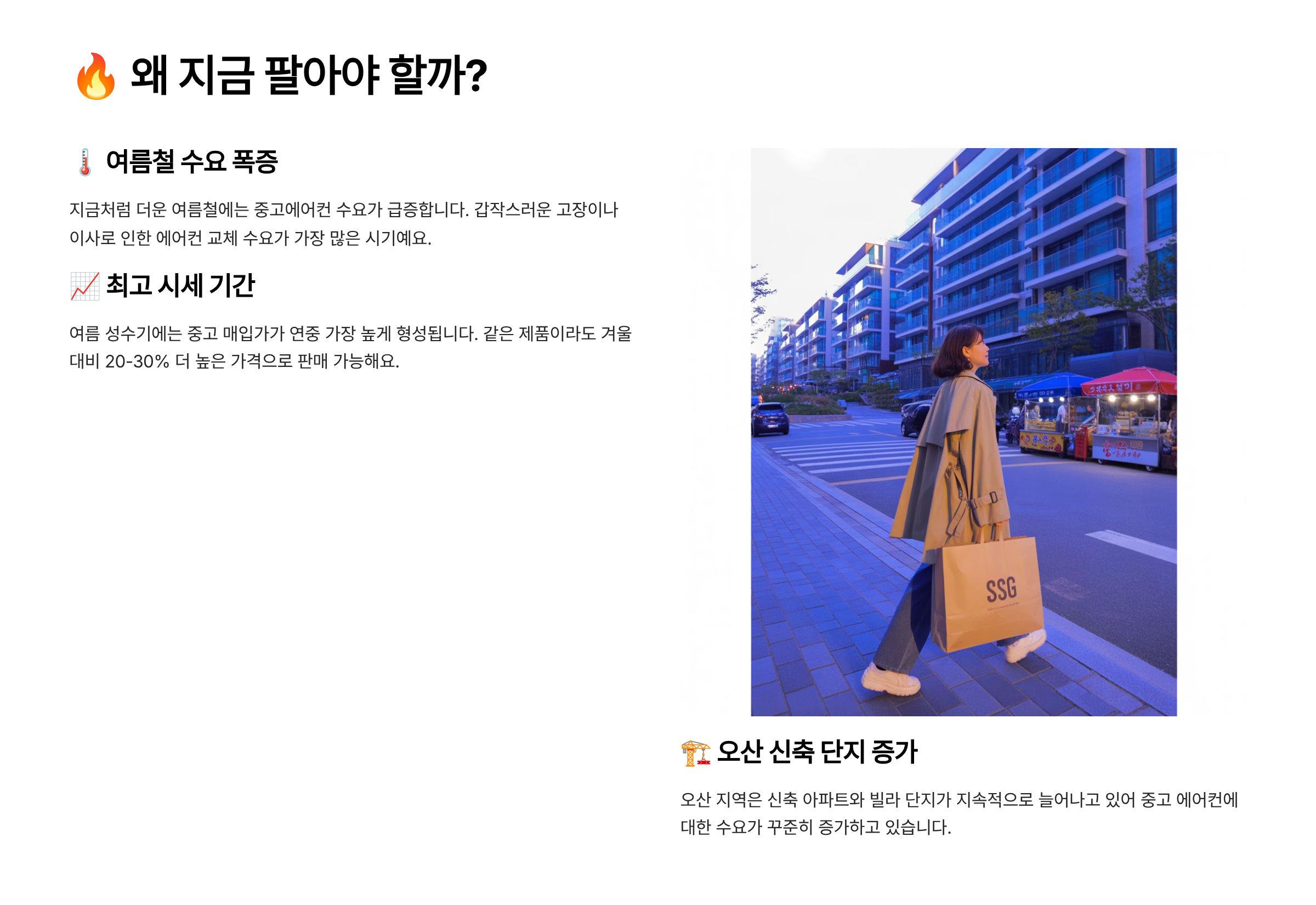 지금처럼 더운 여름, 중고에어컨은 수요가 폭발해요! 특히 오산 지역은 신축 아파트와 빌라 단지가 많아 중고 매입 요청도 급증 중이랍니다. 이럴 때 바로 파는 게 최고의 타이밍이에요. 📈