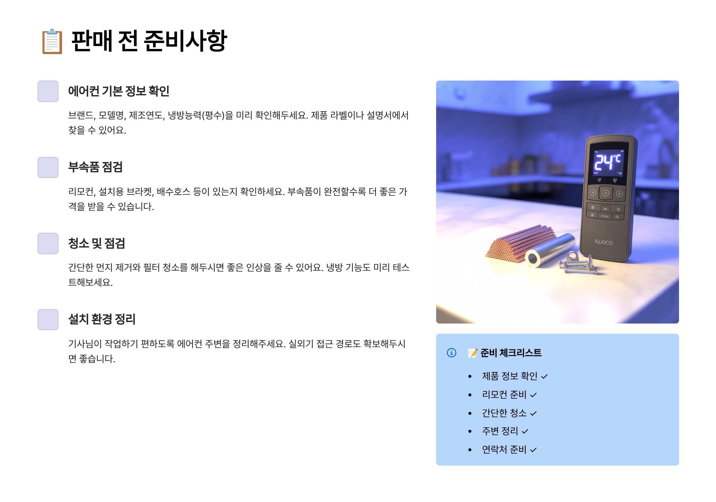 중고에어컨도 준비가 잘 되어 있으면 훨씬 좋은 가격에 거래돼요. 아래 체크리스트만 확인해도 매입가가 10~20% 올라가는 경우도 많아요!
