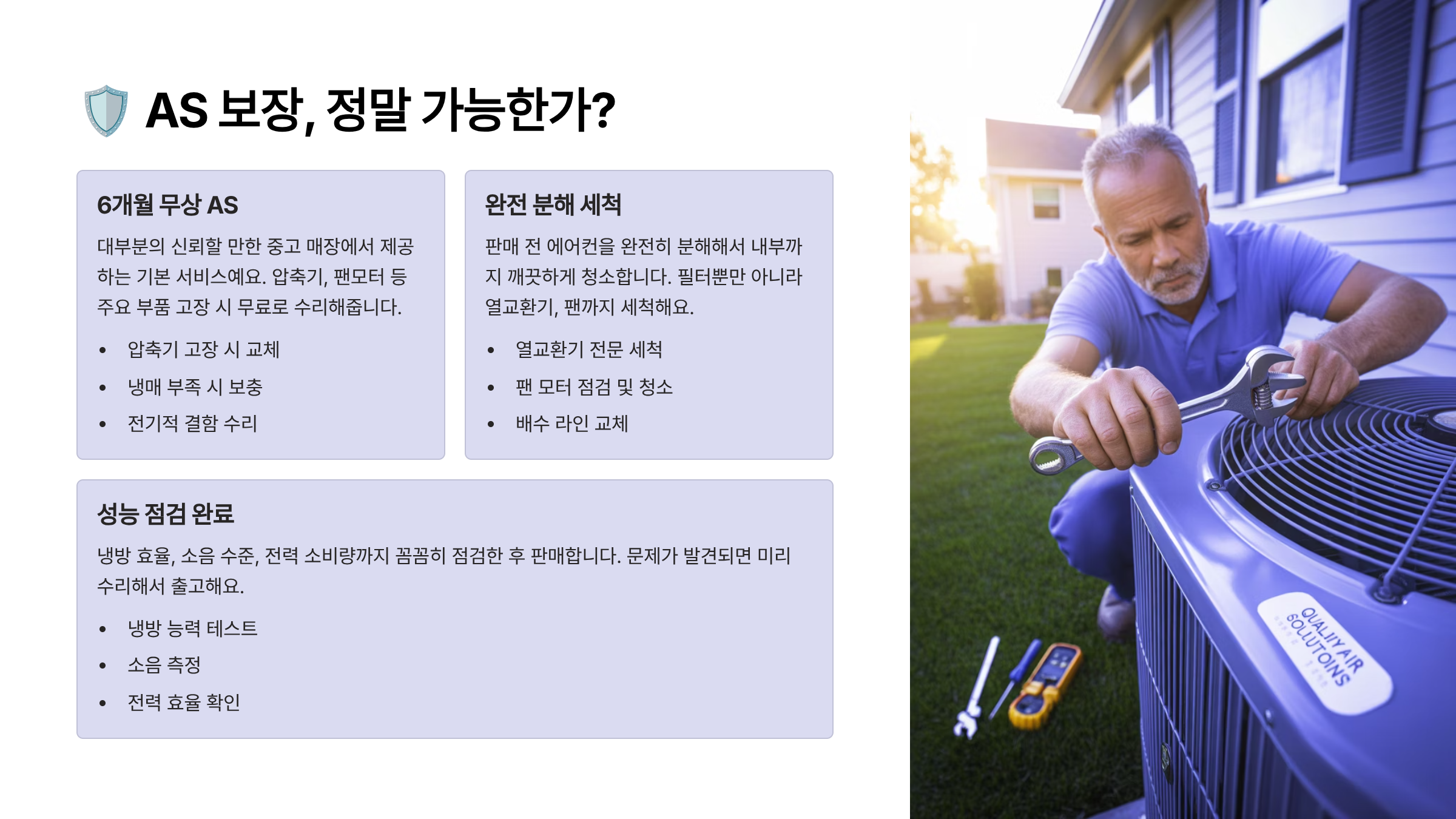 많은 분들이 중고에어컨은 ‘팔고 끝’이라고 생각하지만, 요즘 안양 중고에어컨 전문 매장은 다르게 운영돼요. 기본적으로 6개월 무상 AS를 제공하기 때문에 고장 걱정을 줄일 수 있어요. 🙌