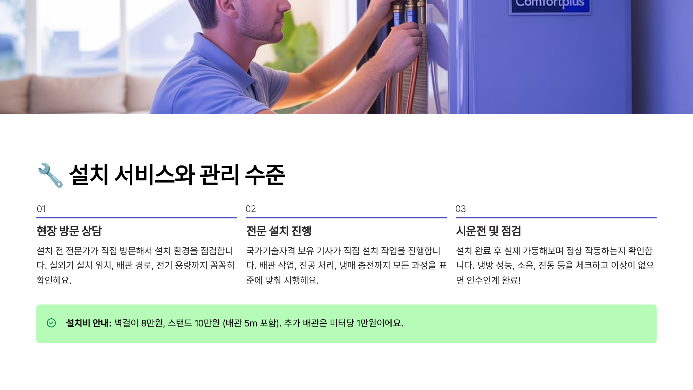 설치 과정에서 발생할 수 있는 추가 비용은 사전에 안내되며, 불필요한 부품 교체는 하지 않는 점이 신뢰 포인트예요. 실외기 위치 선정도 소음과 환기를 고려해 추천해주셔서 만족도가 높아요.