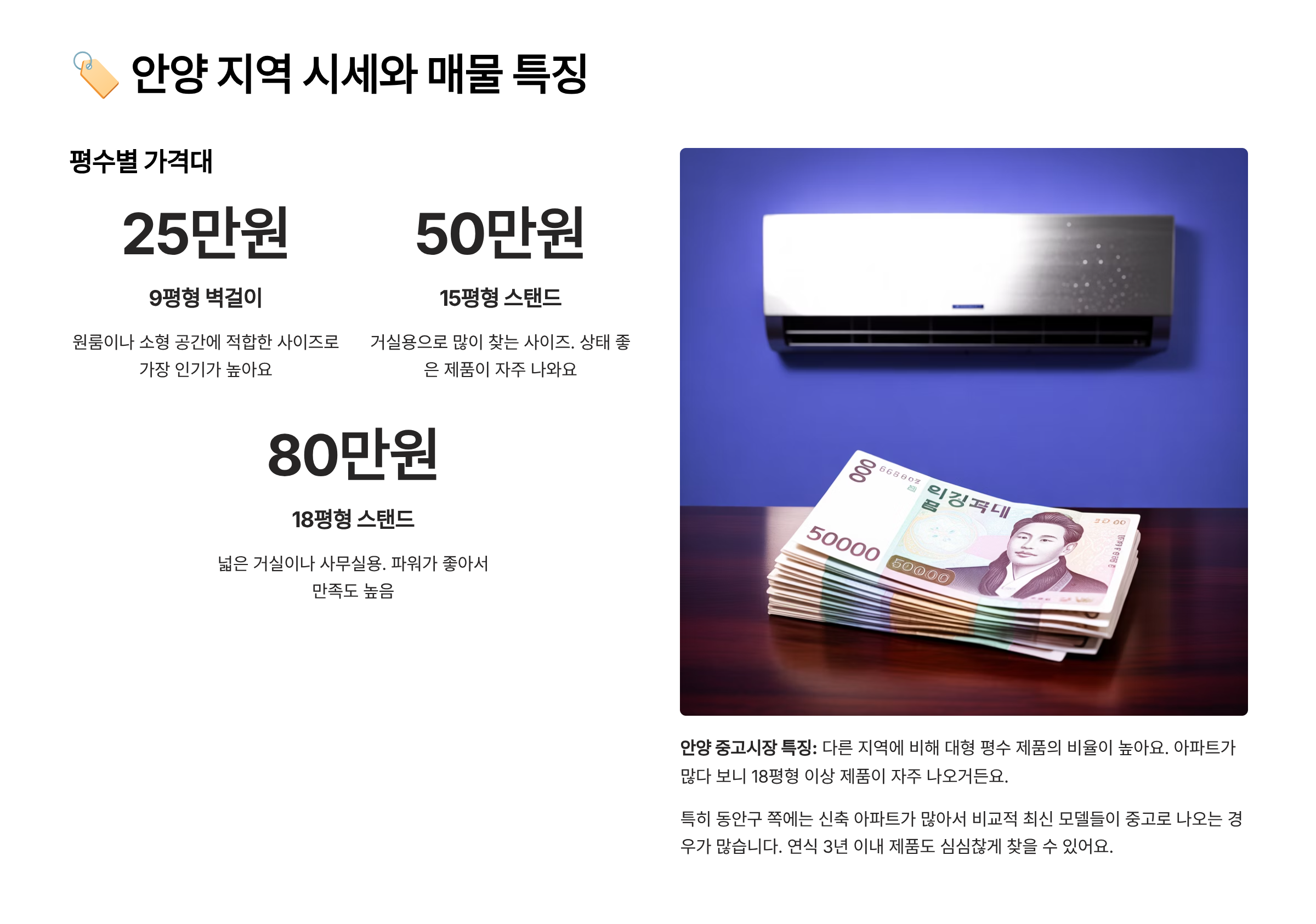 안양은 서울과 인접한 지역이라 유동 인구도 많고, 이사 수요가 높은 편이에요. 그래서 중고가전, 특히 에어컨 매물이 자주 나오죠. 📦