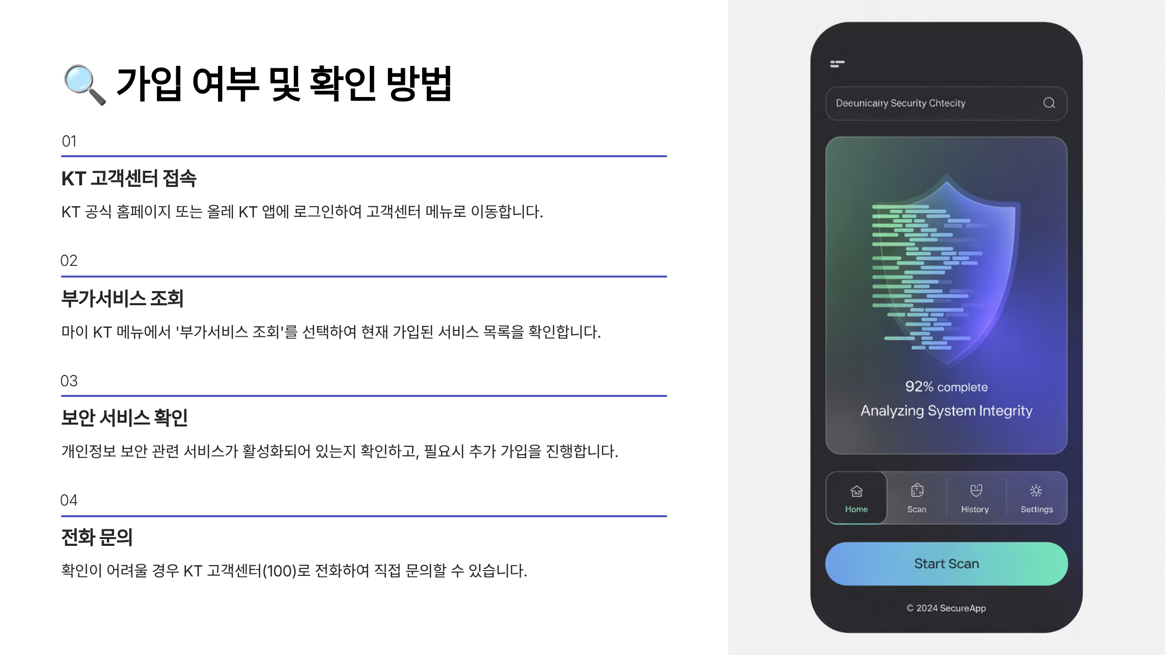 현재 내가 어떤 보안 서비스에 가입되어 있는지 확인하는 방법도 아주 쉬워요. MY KT 앱이나 KT 홈페이지를 통해 확인할 수 있어요.