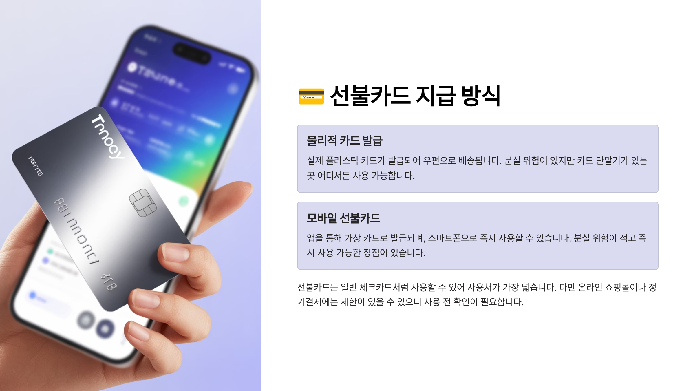 - 선불카드: 카드 수령 시 동봉된 안내문 확인
