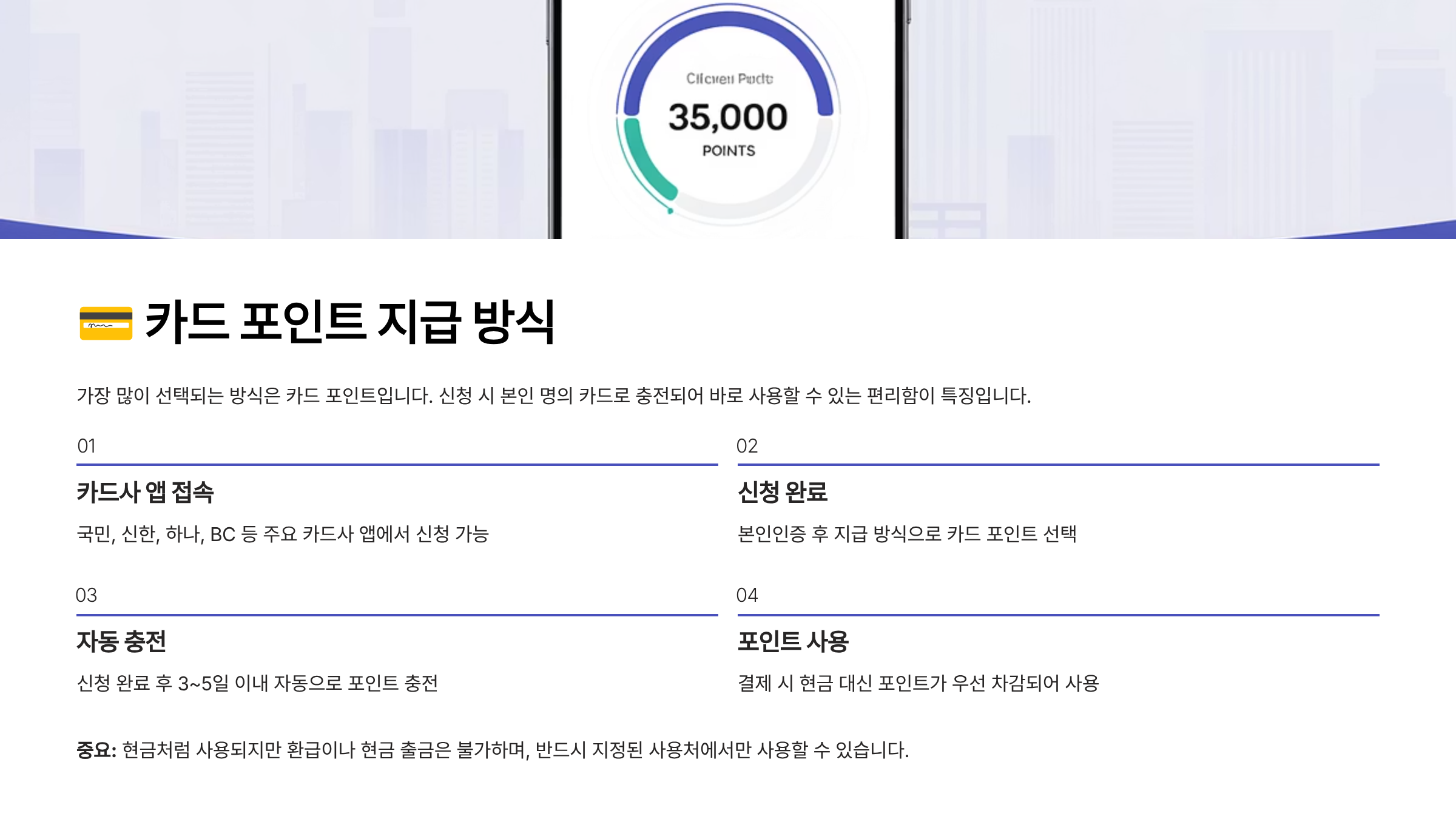 가장 많이 선택되는 방식은 카드 포인트예요. 신청 시 본인 명의 카드로 충전돼서 바로 쓸 수 있답니다.