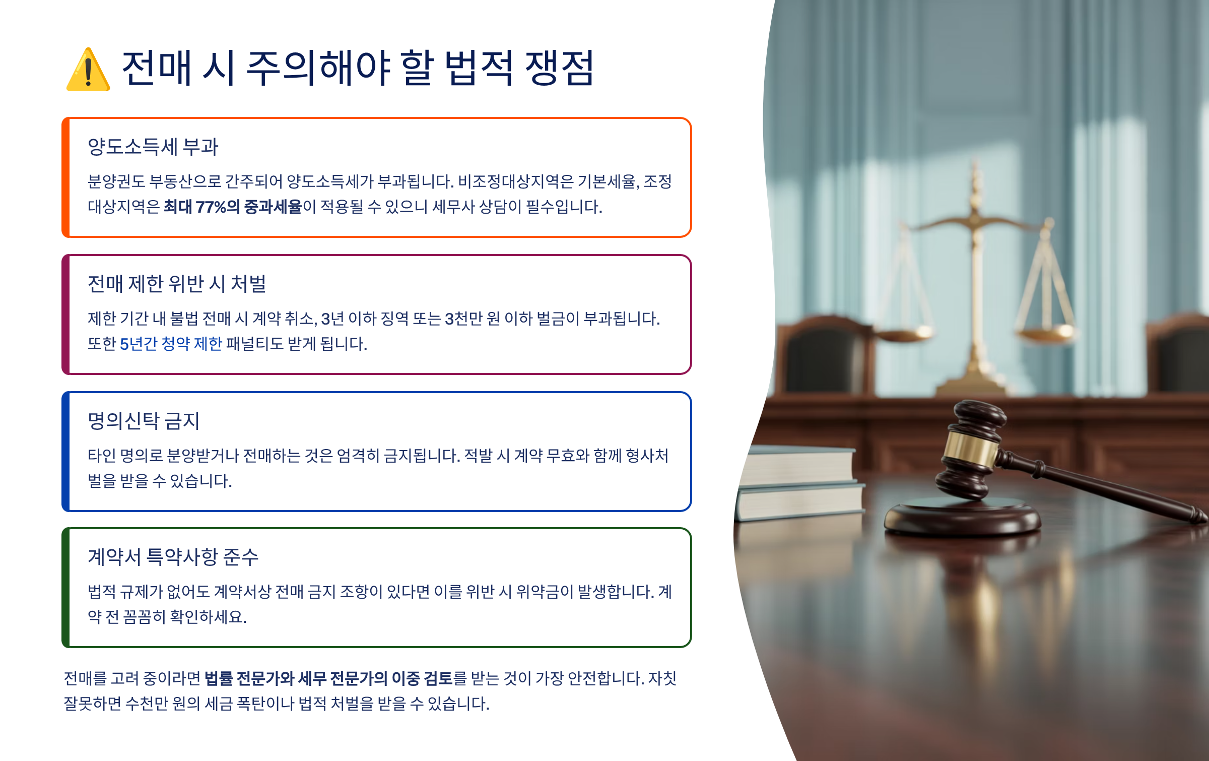 특히 전매 제한을 어긴 경우 계약취소 + 과태료 + 형사처벌까지 받을 수 있어요. 일정 금액 이상의 수익이 발생하면 양도소득세 과세 대상도 될 수 있으니 세무 조언도 필수예요.
