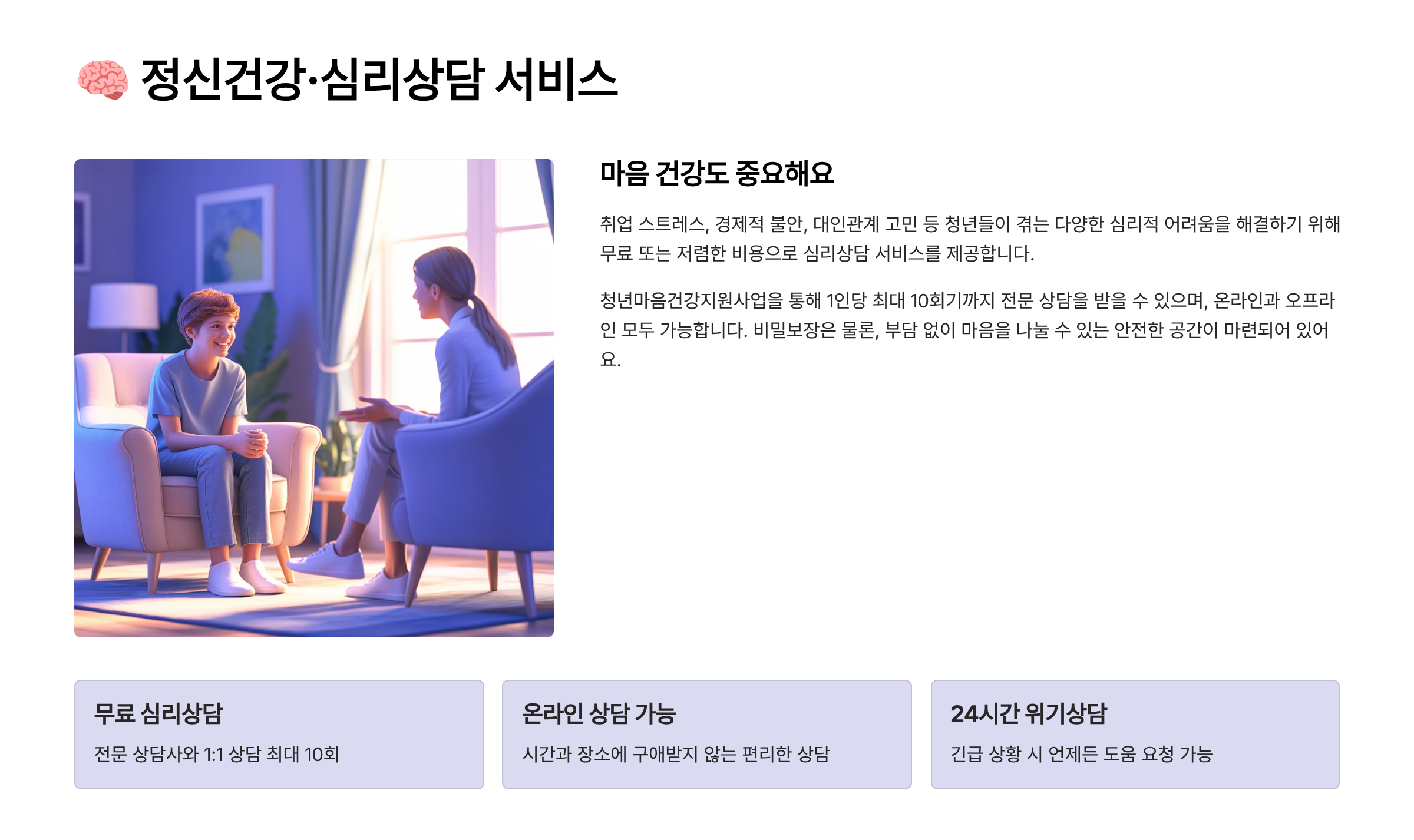 청년정책 통합지원센터에서는 취업, 주거, 학업 스트레스로 지친 청년들을 위해 정신건강 서비스를 무료로 제공하고 있어요. 특히 ‘청년마음건강바우처’는 심리상담 비용을 바우처 형태로 지원해주는 제도예요.