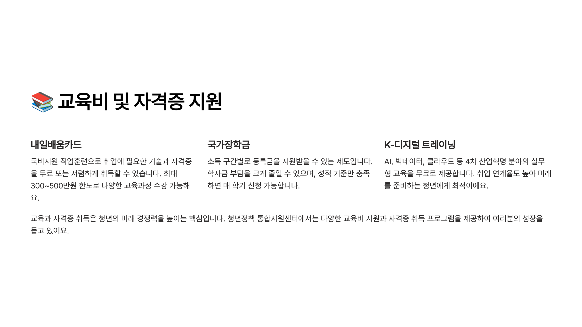 청년정책 통합지원센터에서는 '국가기간전략산업직종 훈련', '내일배움카드+'와 같은 교육 프로그램도 소개해줘요. 1인당 최대 300~500만 원까지 교육비를 지원받을 수 있어요.