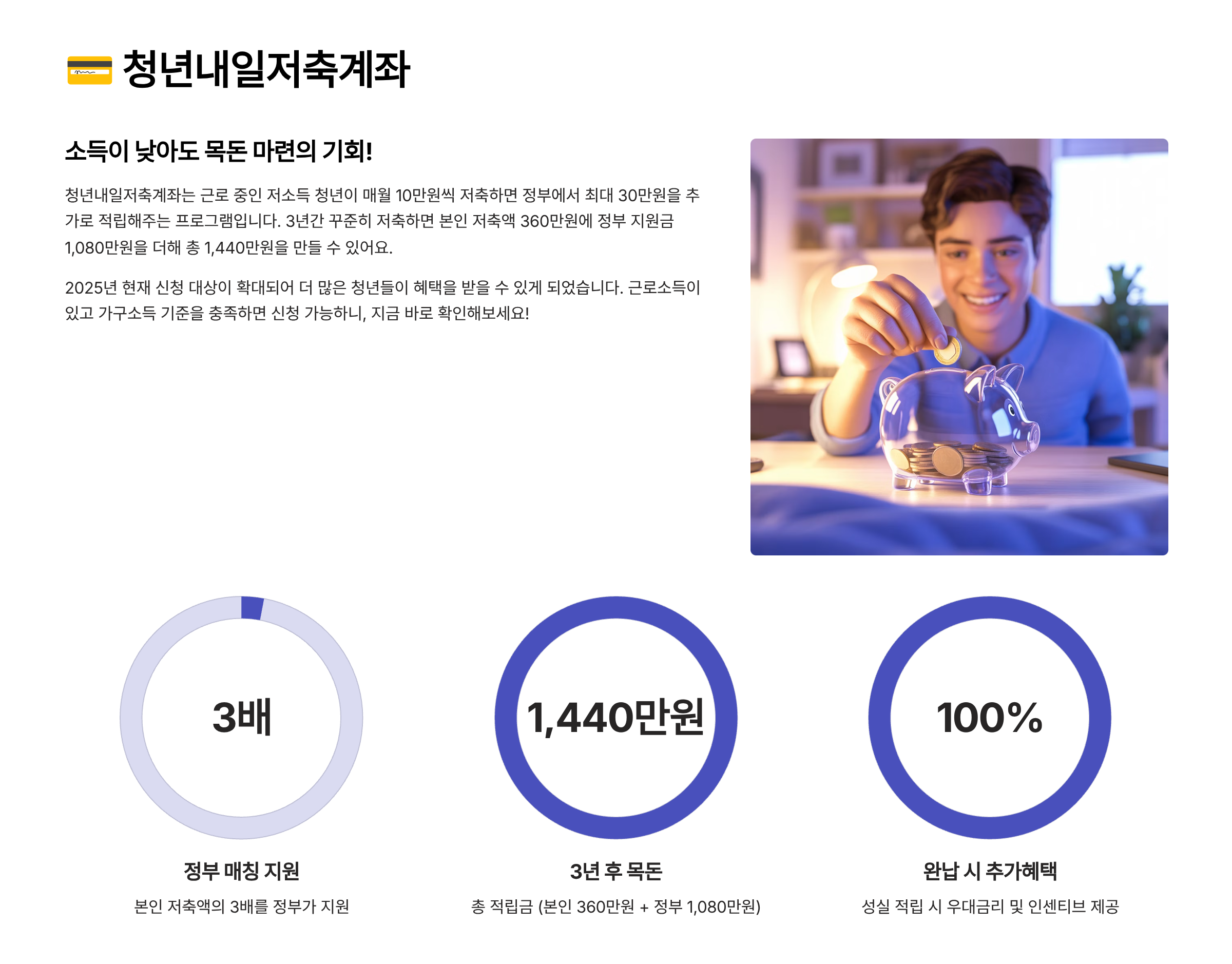 청년내일저축계좌는 매달 10만 원씩 3년 동안 저축하면 정부가 최대 720만 원까지 지원해주는 자산형성 프로그램이에요. 저소득 청년에게는 정말 실질적인 자립 기반이 돼요.