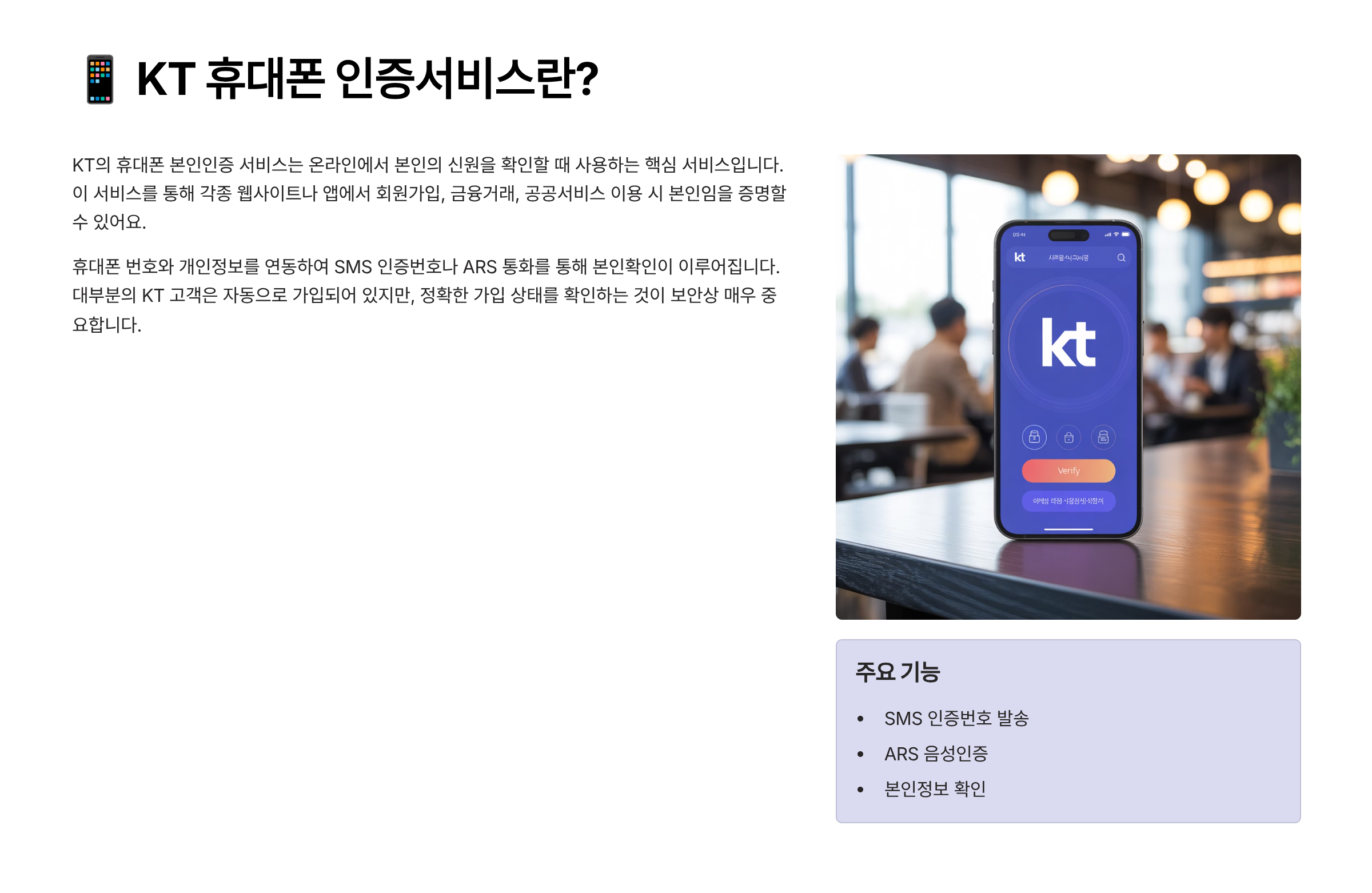 📋 목차📱 KT 휴대폰 인증서비스란?🔎 가입 여부 확인이 중요한 이유✅ KT 인증서비스 가입 여부 확인 방법📲 모바일로 확인하는 방법💻 PC에서 확인하는 방법📞 고객센터로 확인하는 방법❓ FAQ요즘은 거의 모든 온라인 서비스에서 본인확인을 요구하죠. 그 중심에 있는 것이 바로 ‘휴대폰 인증 서비스’예요. KT 사용자라면 기본적으로 ‘휴대폰 본인인증 서비스’에 가입되어 있을 수 있는데, 이게 내 명의로 제대로 등록되어 있는지 확인하는 건 정말 중요해요. 명의 도용, 모르는 곳에서의 인증 요청, 이상한 문자 수신 등… 혹시 를 보안 위협을 막기 위한 첫걸음이 바로 이 ‘가입 여부 확인’이에요. 내가 생각했을 때 이건 스마트폰을 사용하는 모든 사람의 기본 점검 리스트로 꼭 챙겨야 할 내용이에요. ?..