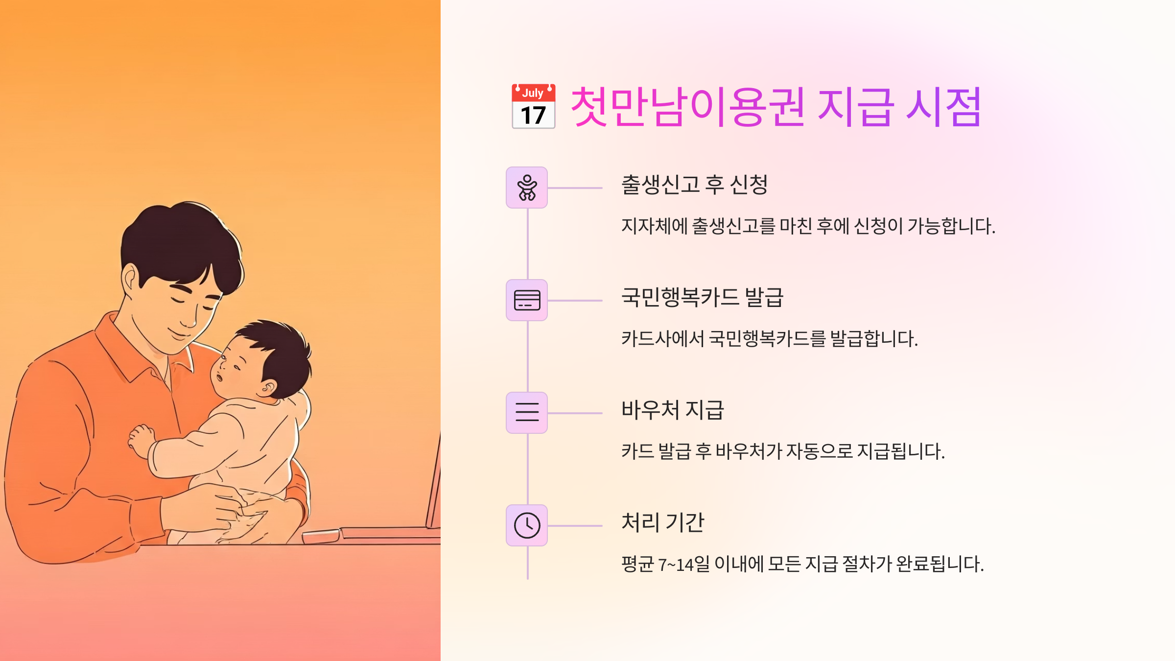 📋 목차📅 첫만남이용권 지급 시점📝 신청부터 지급까지 절차📲 지급 여부 확인 방법⏳ 지급 지연 시 대처법💳 국민행복카드 발급 시기📨 지급 안내 문자 시점💡 빠르게 받는 꿀팁❓ FAQ출산을 마친 가정이라면 첫만남이용권이 언제 지급되는지 궁금하실 거예요!이 바우처는 신생아 1인당 200만 원이 지급되며, 출생신고와 이용권 신청 이후 카드에 충전되는 방식이에요. 지급 시점은 신청 후 보통 **5일~10일 이내**지만, 지역이나 카드사 상황에 따라 차이가 있어요.신청만 하면 자동 지급되는 게 아니라는 점도 꼭 기억해야 해요! 그럼 아래에서 언제, 어떤 절차를 통해 받게 되는지 전체 과정을 정리해드릴게요 😊 👇 다음 박스에서 지급 시점과 상세 절차 확인해보세요!📅 첫만남이용권 지급 시점첫만남이용..